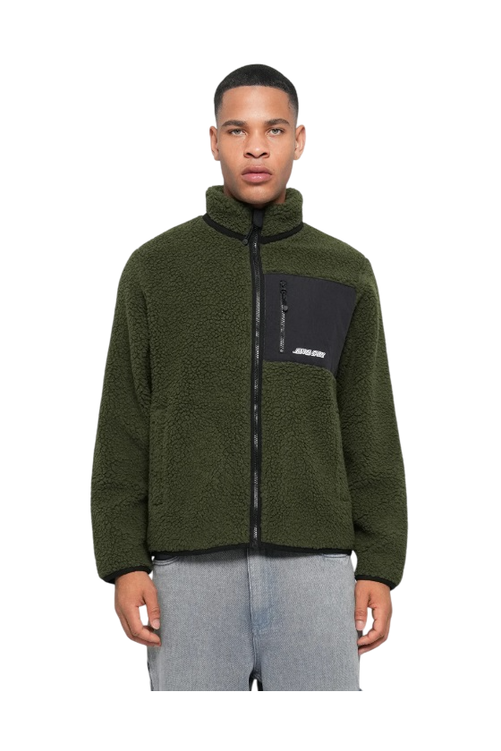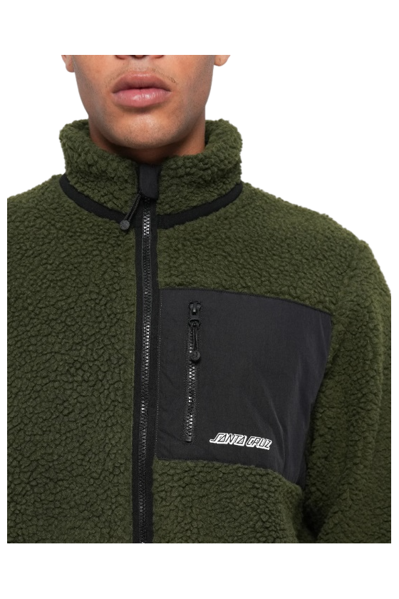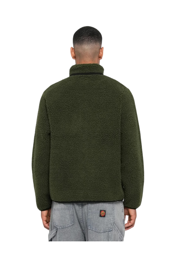 Abrigo Santa cruz freestyle, en tono verde, forro polar sherpa, con cremallera frontal completa, ribete en dobladillos y cuello, bolsillo frontal estampado en negro, y doble bolsillo delantero para manos.