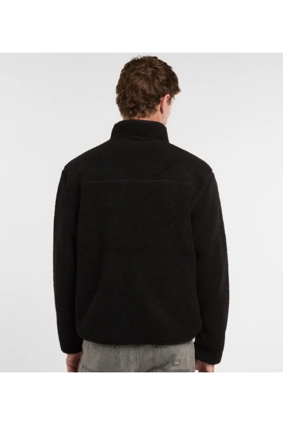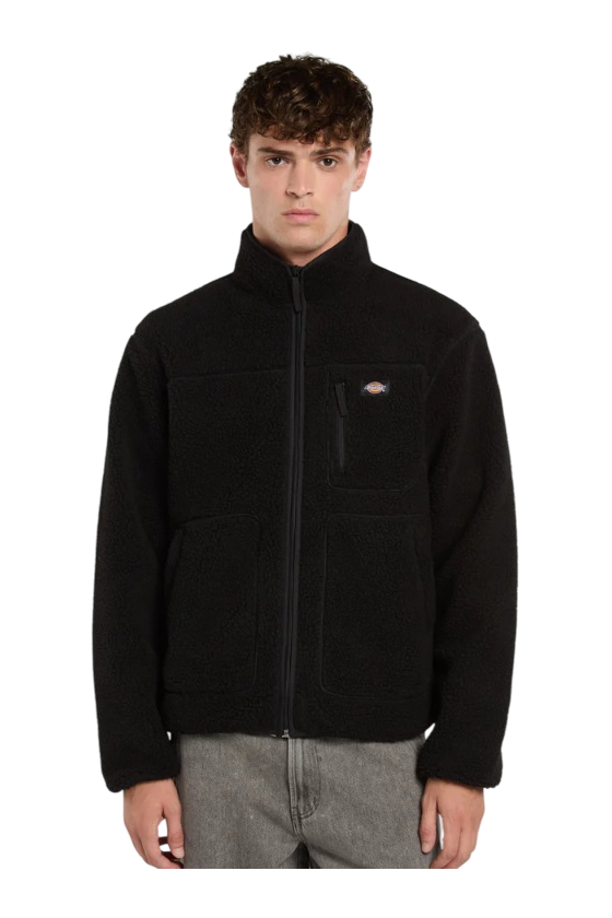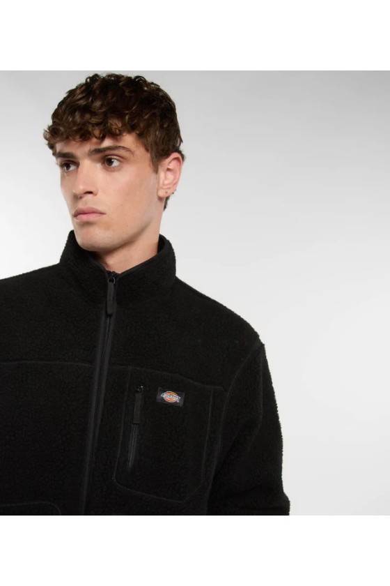 Chaqueta forro polar Dickies Mount Hope de corte holgado, en tono negro, forro polar sherpa, con cremallera frontal completa, cuello alto, bolsillo en pecho con etiqueta dickies y doble bolsillo frontal para resguardar las manos del frío. Tejido anti arrugas y anti encogimiento.