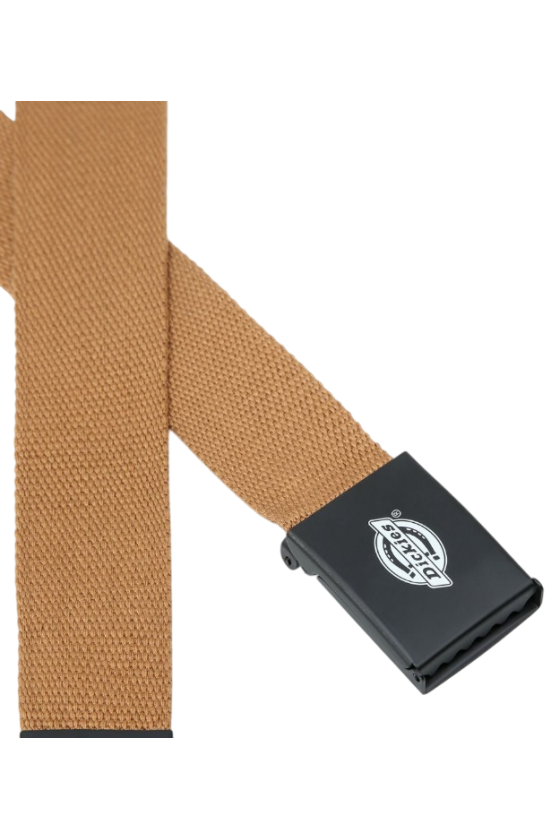 Cinturón en color marrón (duck brown) de Dickies, ajustable a cintura con hebilla metálica negra con logotipo dickies en Blanco.