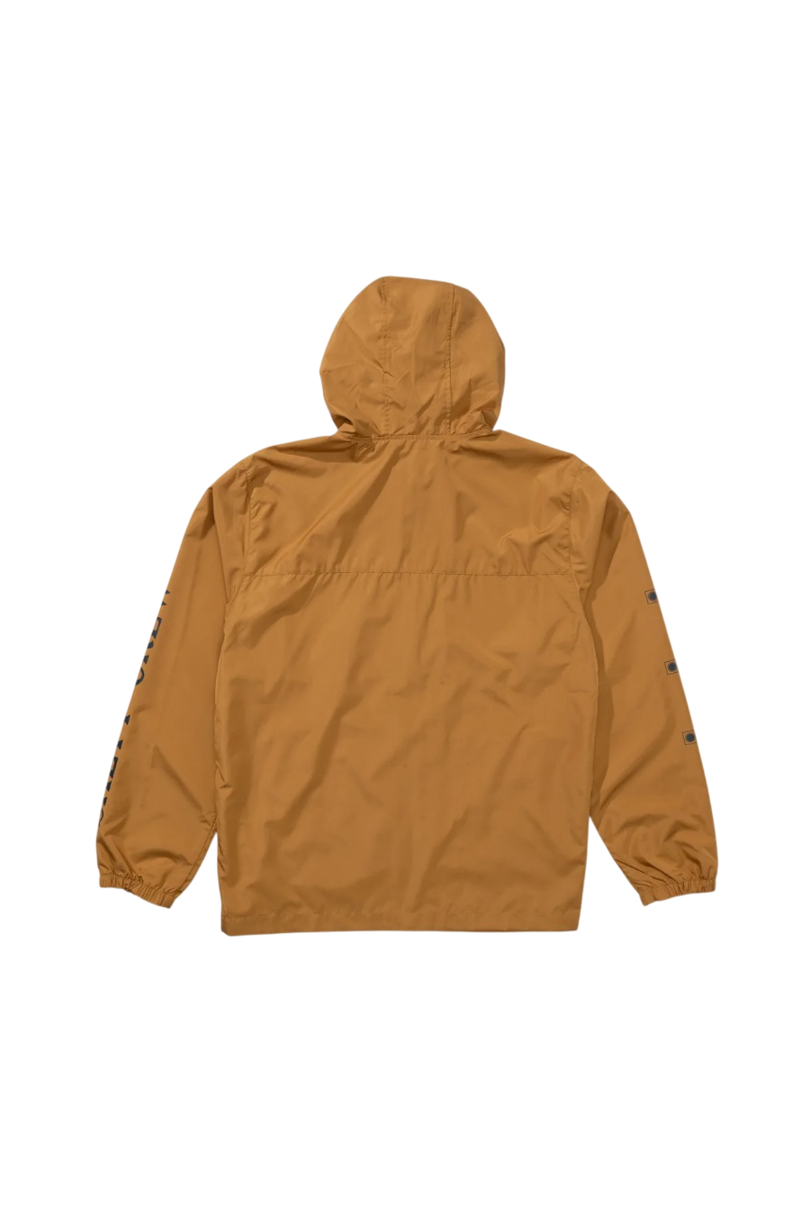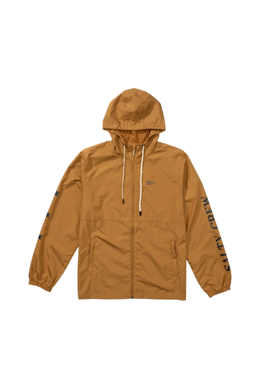 Chaqueta impermeable de Salty Crew, modelo surface, en color Bone Brown (tono marrón tipo mostaza) con prints en pecho y mangas, repelente al agua, muy ligero, cómodo, con bolsillos delanteros, cierre con cremallera y una relación calidad precio increible.