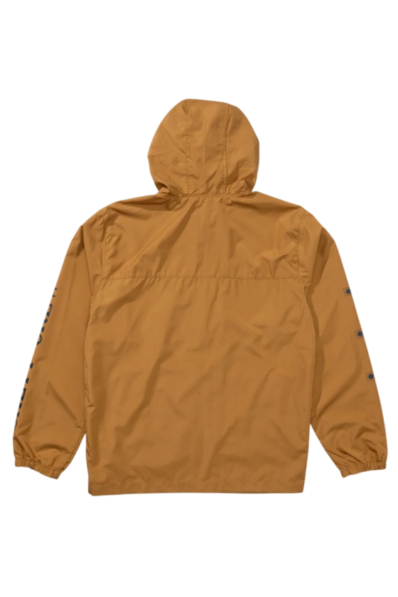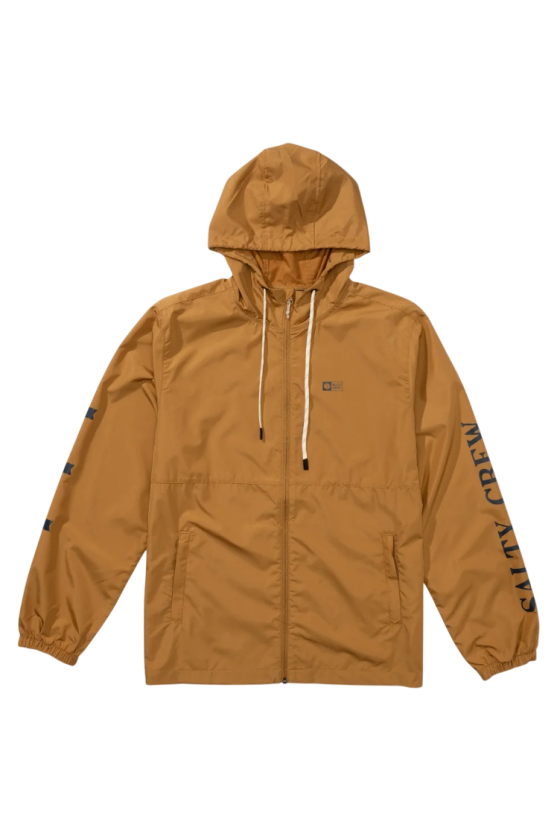 Chaqueta impermeable de Salty Crew, modelo surface, en color Bone Brown (tono marrón tipo mostaza) con prints en pecho y mangas, repelente al agua, muy ligero, cómodo, con bolsillos delanteros, cierre con cremallera y una relación calidad precio increible.