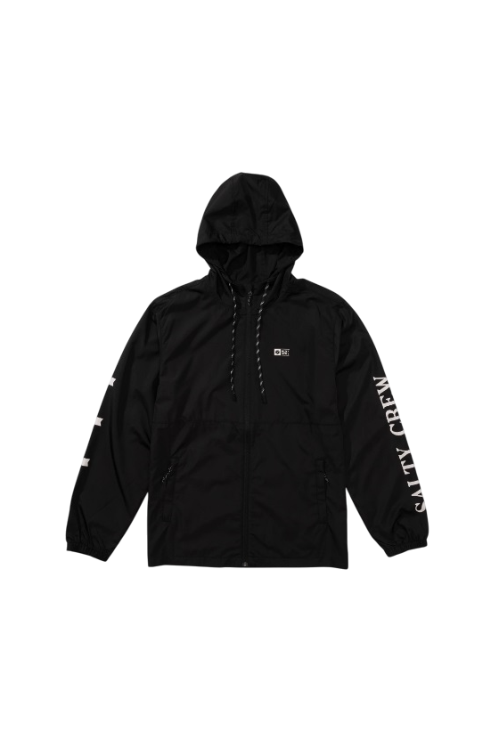 Chaqueta impermeable de Salty Crew, modelo surface, en color Negro con prints en pecho y mangas en color blanco, repelente al agua, muy ligero, cómodo, con bolsillos delanteros, cierre con cremallera y una relación calidad precio increible.