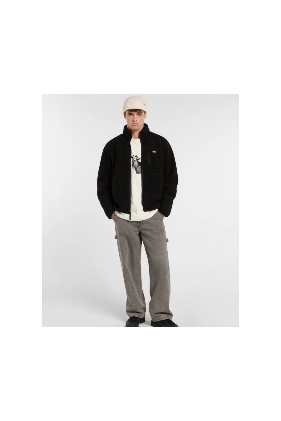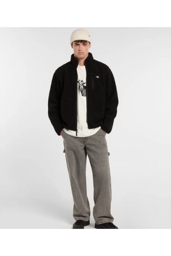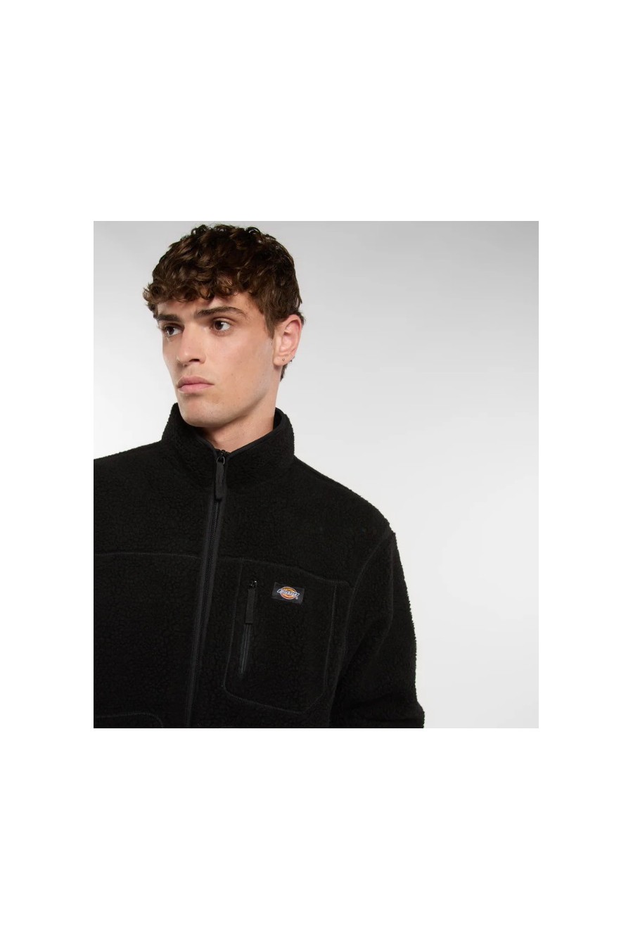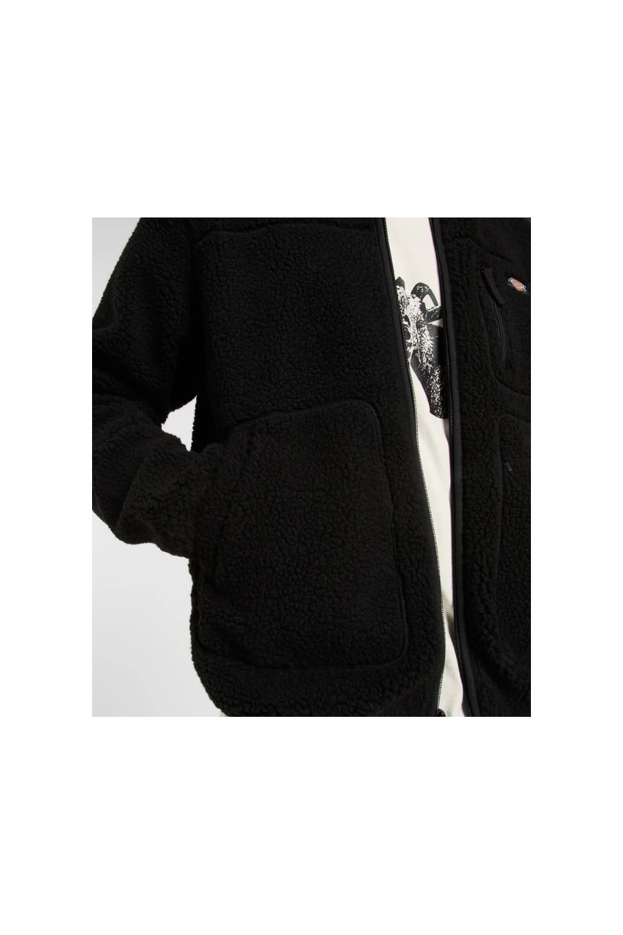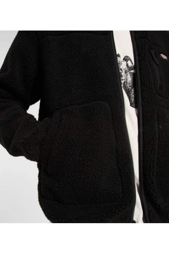 Chaqueta forro polar Dickies Mount Hope de corte holgado, en tono negro, forro polar sherpa, con cremallera frontal completa, cuello alto, bolsillo en pecho con etiqueta dickies y doble bolsillo frontal para resguardar las manos del frío. Tejido anti arrugas y anti encogimiento.