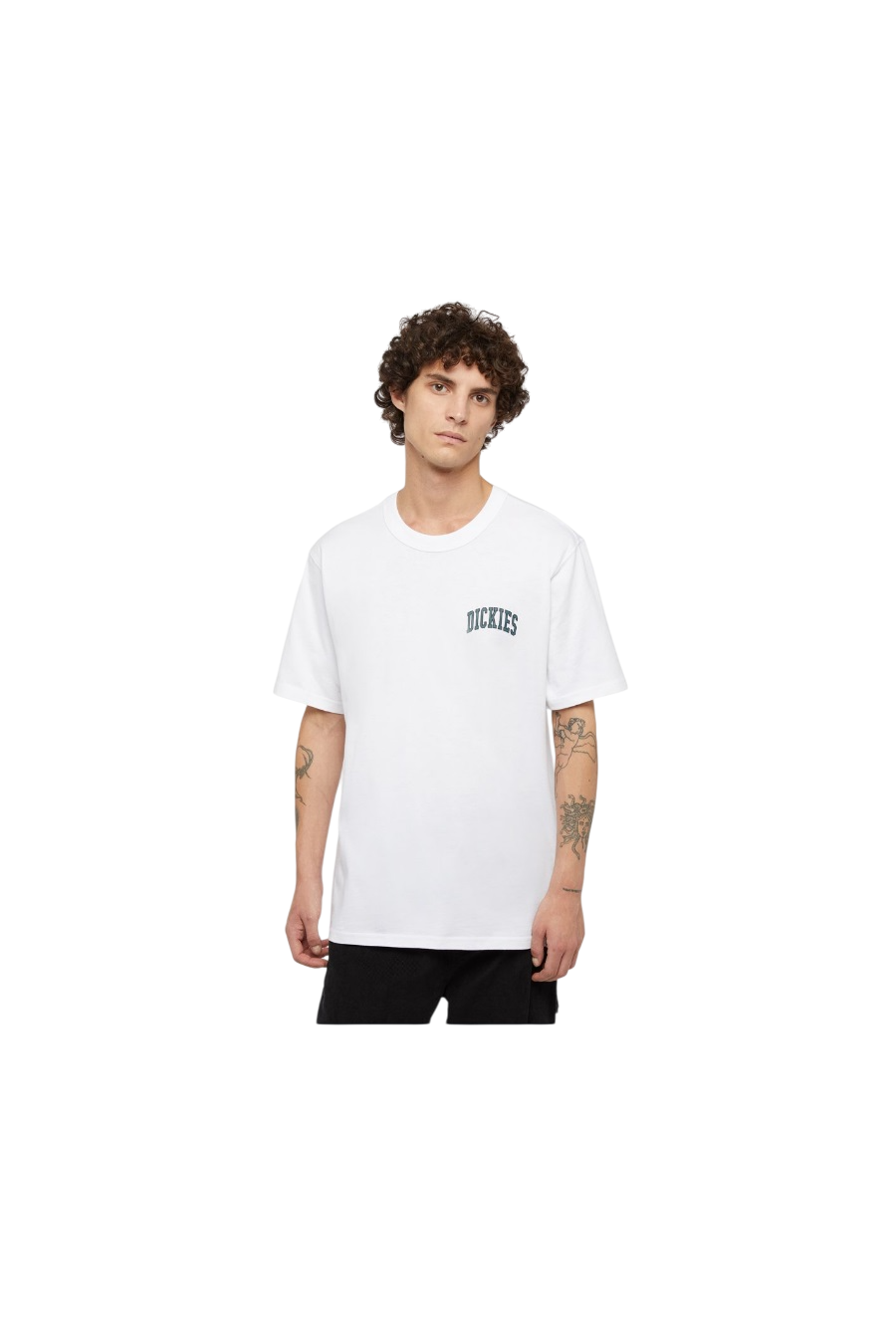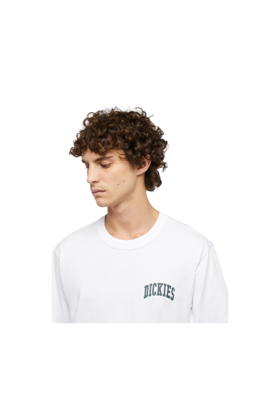 Camiseta Dickies Aitkin en color blanca, con logotipo en pecho de la marca.Camiseta de corte recto, cuello redondo y 100% algodón. Nueva Colección Otoño 2025 de Dickies ya disponible en Grado90 Zaragoza.