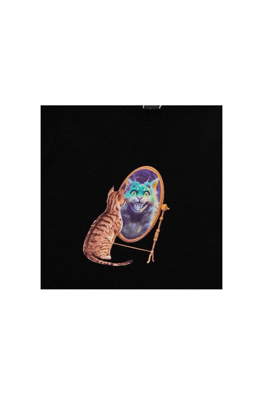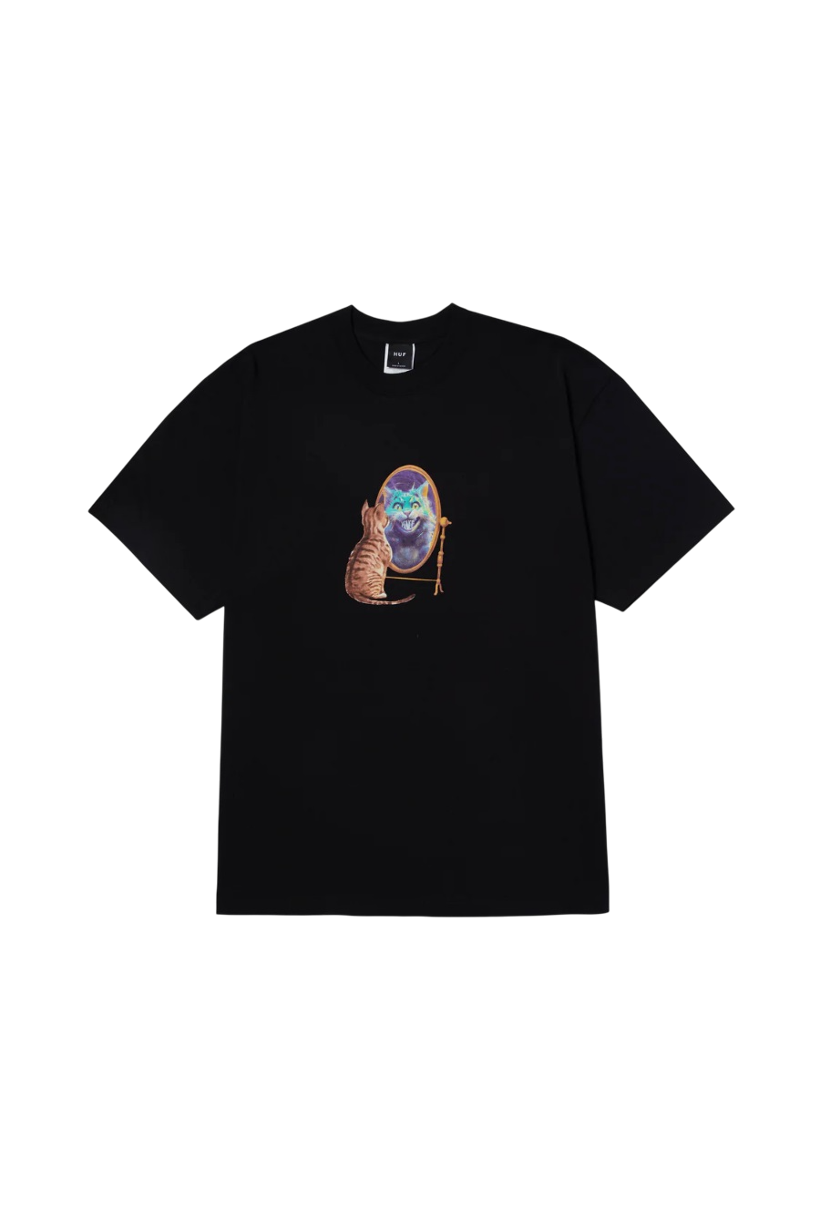 Camiseta Huf modelo Mirror de la nueva temporada primavera verano 2025 de la marca. Camiseta de manga corta, en color negra cuello redondo y logotipo delantero a color perfecta para los amantes de los gatos, fabricada en 100% algodón, corte standard.