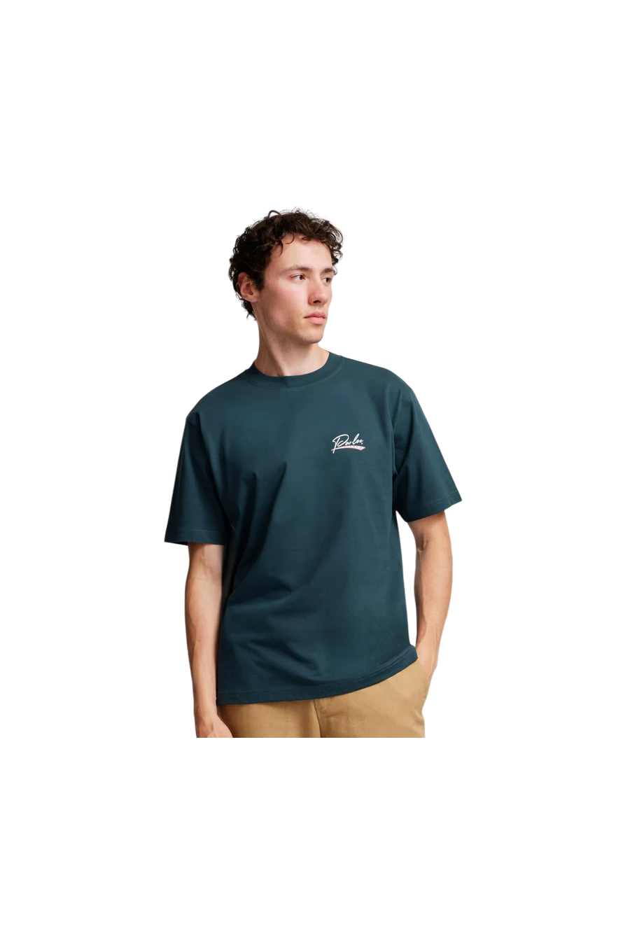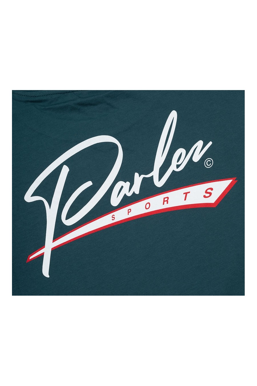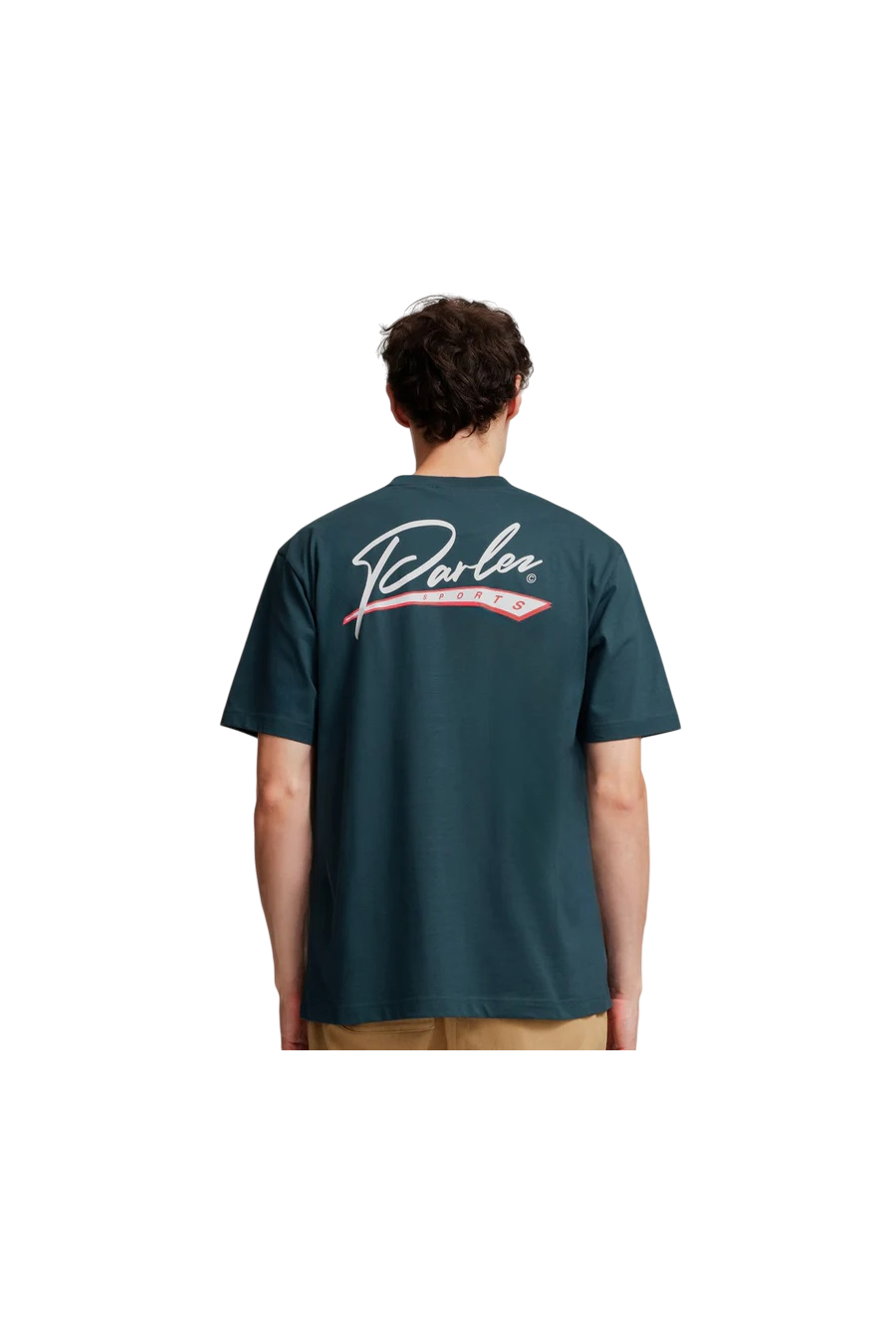 Camiseta de Manga Corta Parlez Clothing, con logotipo delantero y en espalda en tono, camiseta color petrol (verdosa) con cuello redondo fabricada en 100% algodón certificado. Nueva Temporada Parlez 2025. Grado 90