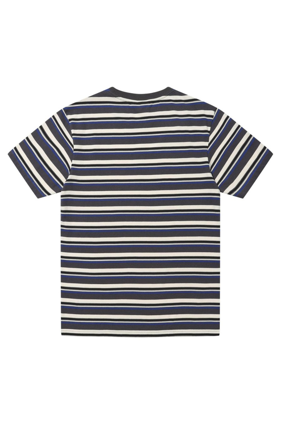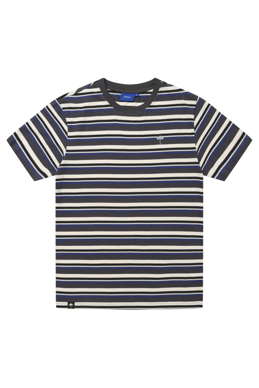 Camiseta de manga corta Helas, en tono azul con decoración de rayas a colores en toda ella. Logotipo bordado Helas delantero bordado en pecho, corte standard, fabricada en algodón 100%. Helas en grado 90 Zaragoza.
