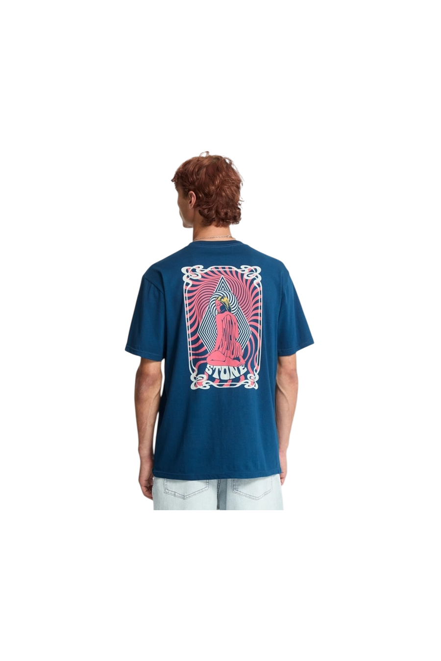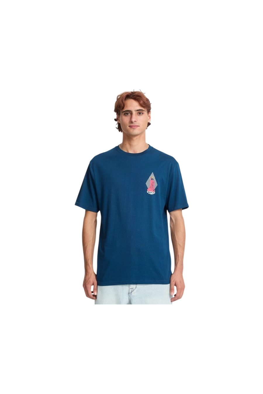 Camiseta de manga corta Volcom Psychback en color cosmic blue, con prints en parte delantera y espalda. Camiseta de corte standard, cuello redondo y 100% algodón orgánico. Nueva Colección Volcom Otoño invierno 2025 ya disponible en Grado 90 Zaragoza.