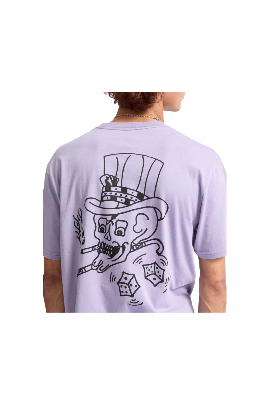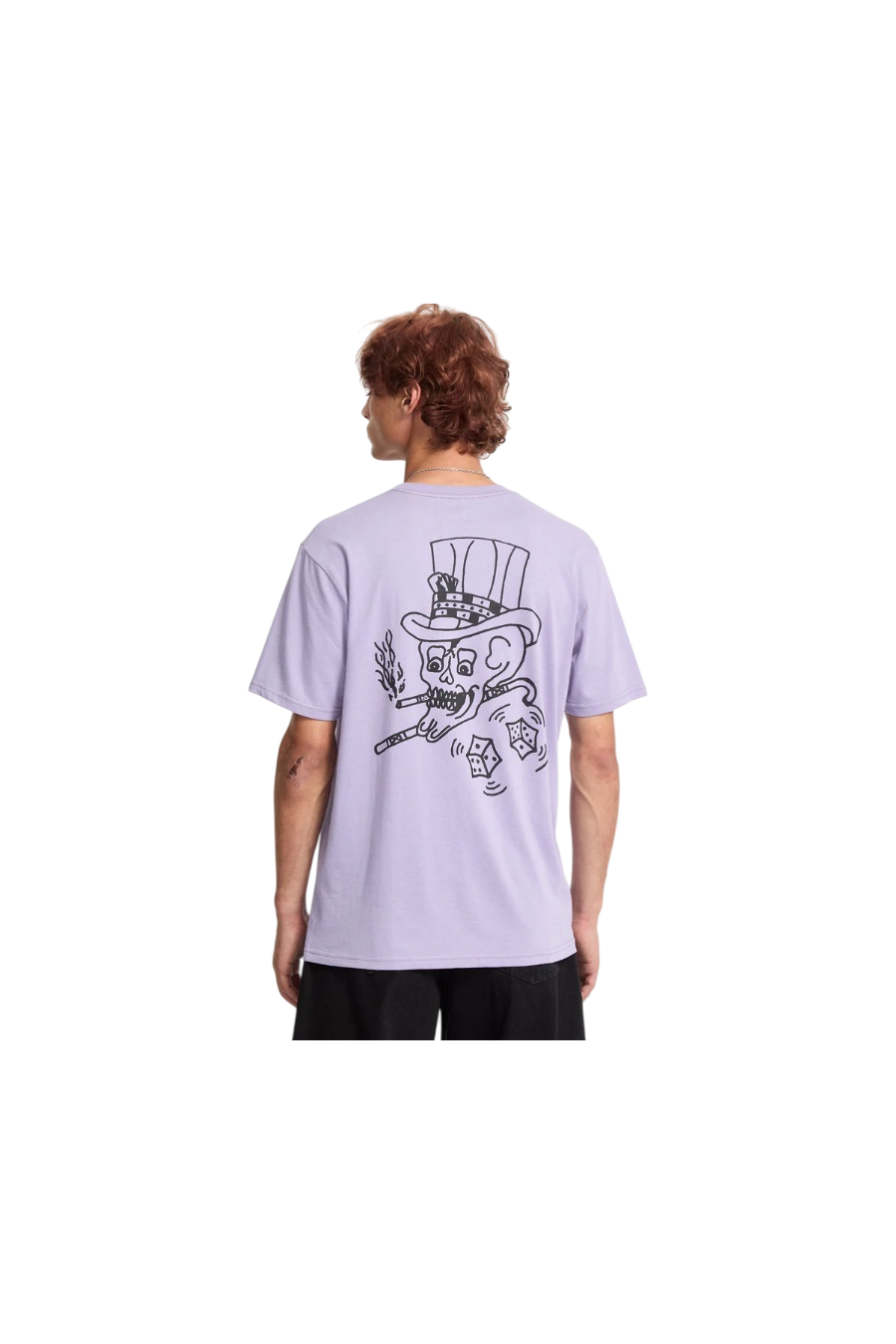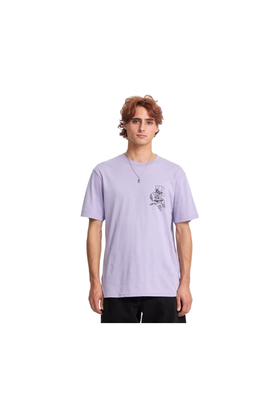 Camiseta de manga corta Volcom Harry en color purple ash (morado), con prints en parte delantera y espalda en color negro. Camiseta de corte standard, cuello redondo y 100% algodón orgánico. Nueva Colección Volcom Otoño invierno 2025 ya disponible en Grado 90 Zaragoza.