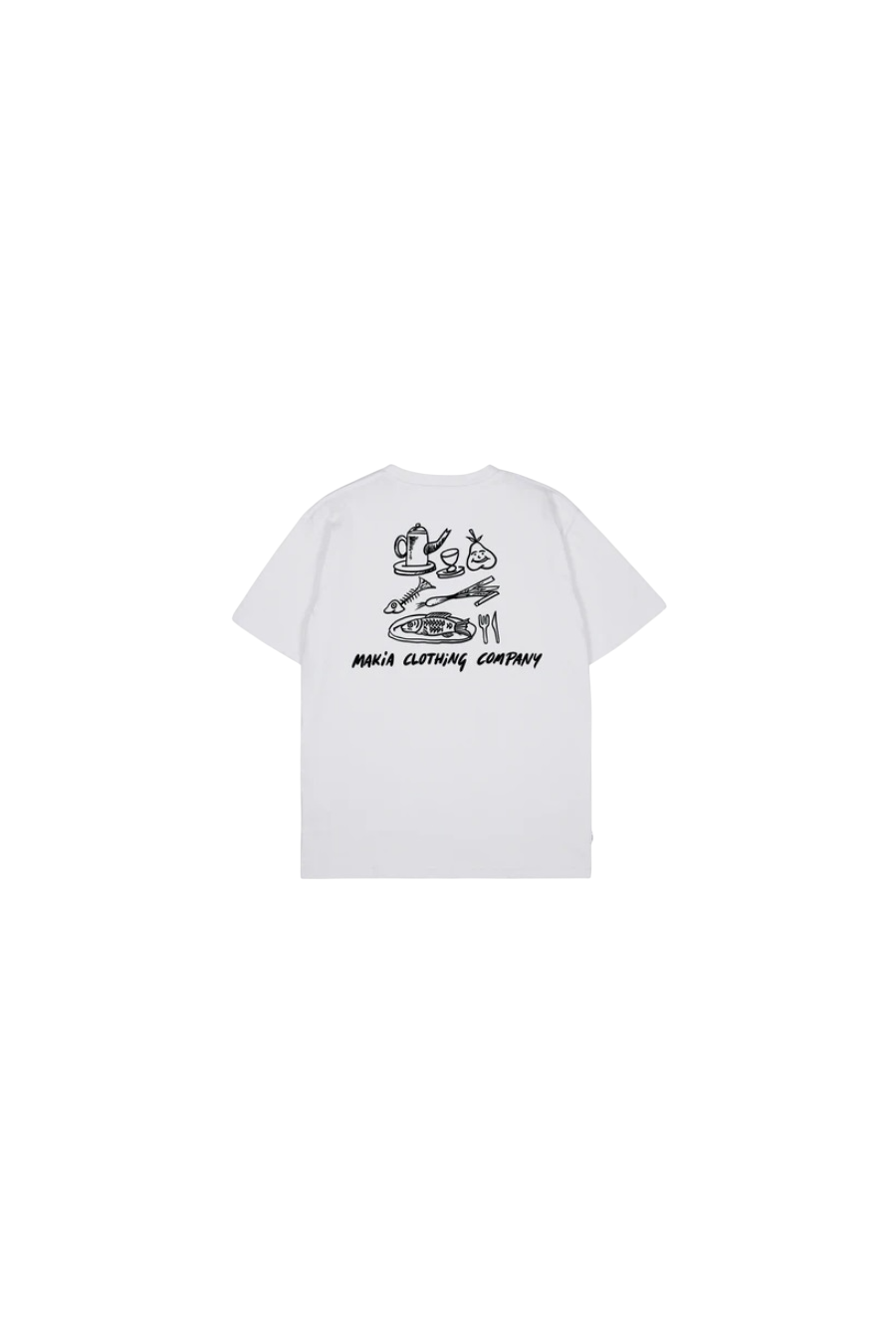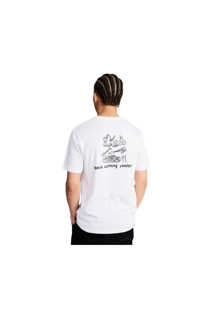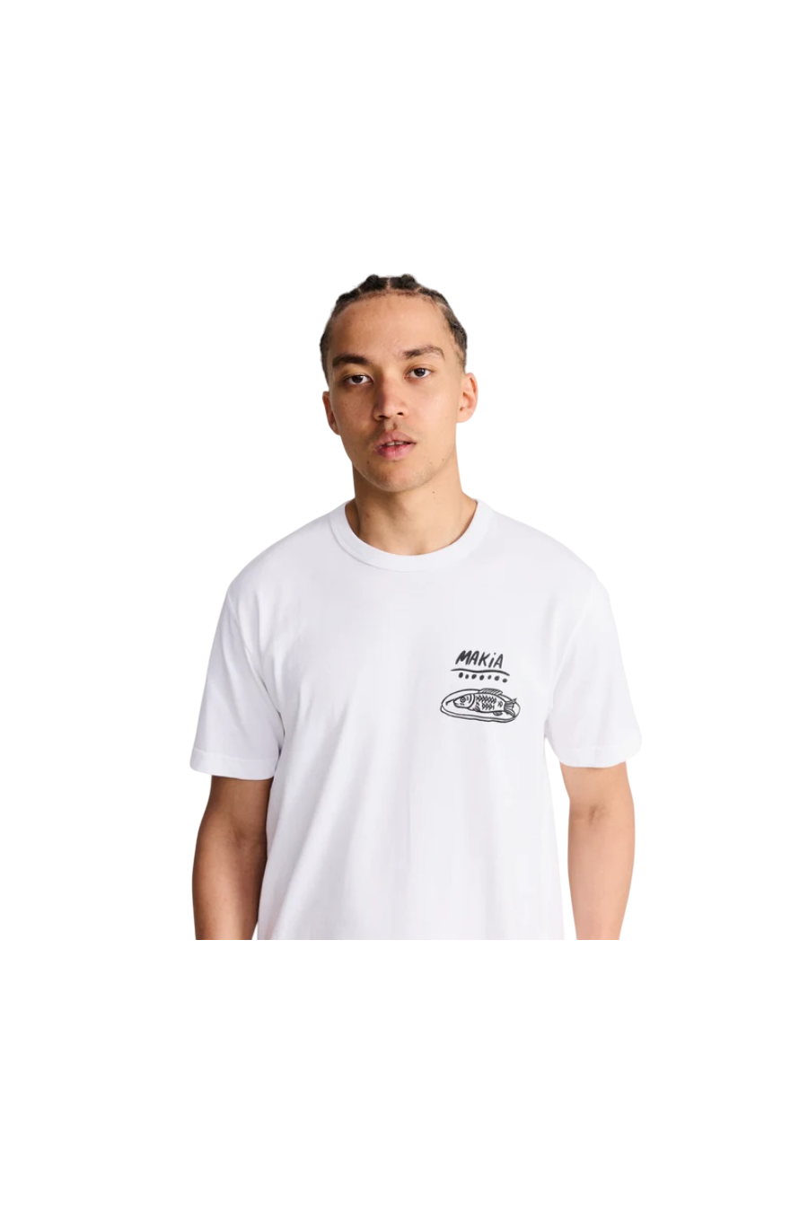 Camiseta Makia de manga corta y cuello redondo, modelo Makia Navigator en color blanca con logotipos en pecho y espalda en tono negro, camiseta perteneciente a la nueva colección de la marca Finlandesa!