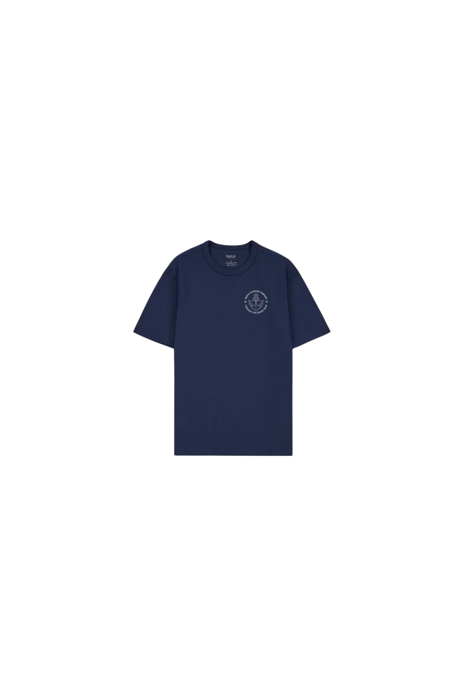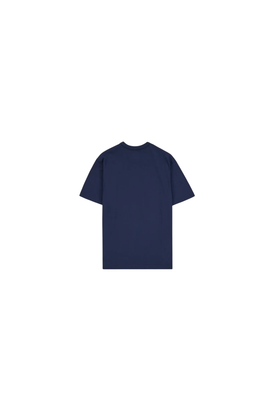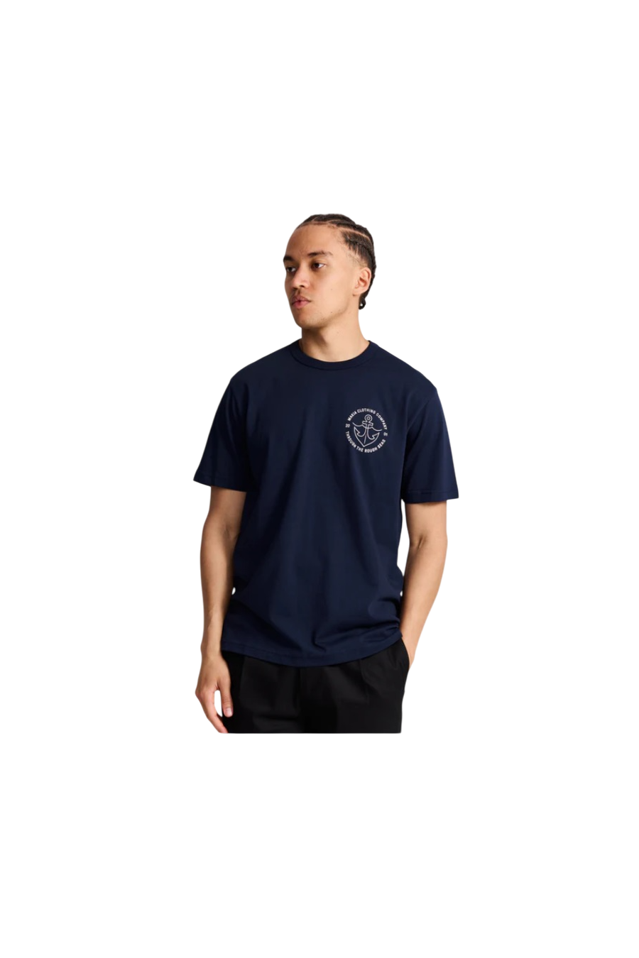 Camiseta Makia de manga corta y cuello redondo, modelo Makia Barbless en color azul marina )navy) con logotipos en pecho y espalda en color blanco, camiseta perteneciente a la nueva colección otoño invierno 2025 de la marca Finlandesa! Fabricada en algodón orgánico certificado 100%.