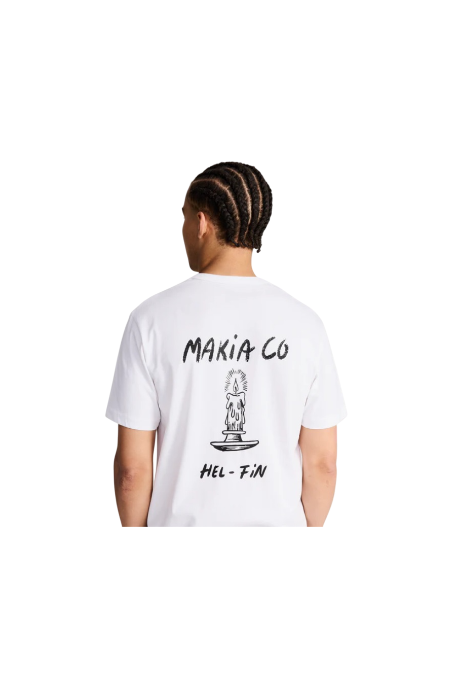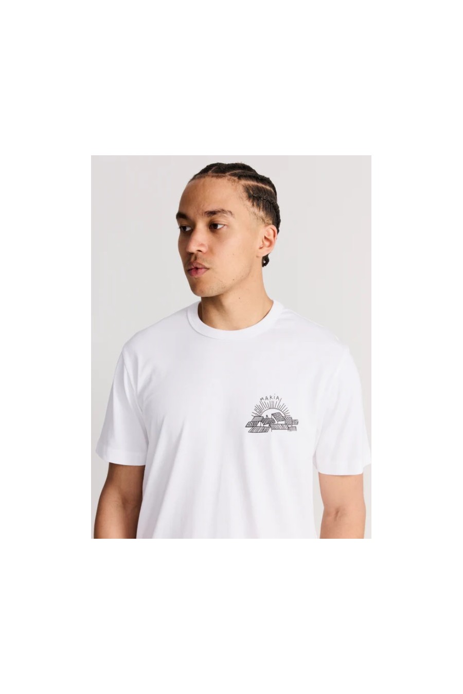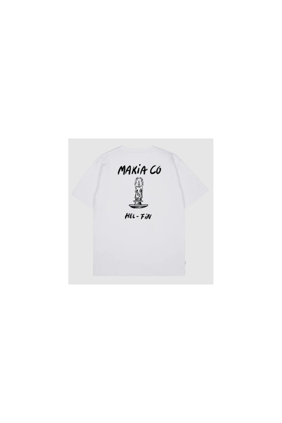 Camiseta Makia de manga corta y cuello redondo, modelo Makia Cosy en color blanca con logotipos en pecho y espalda en color negro , camiseta perteneciente a la nueva colección 2025 de la marca Finlandesa! Fabricada en algodón orgánico certificado 100%.
