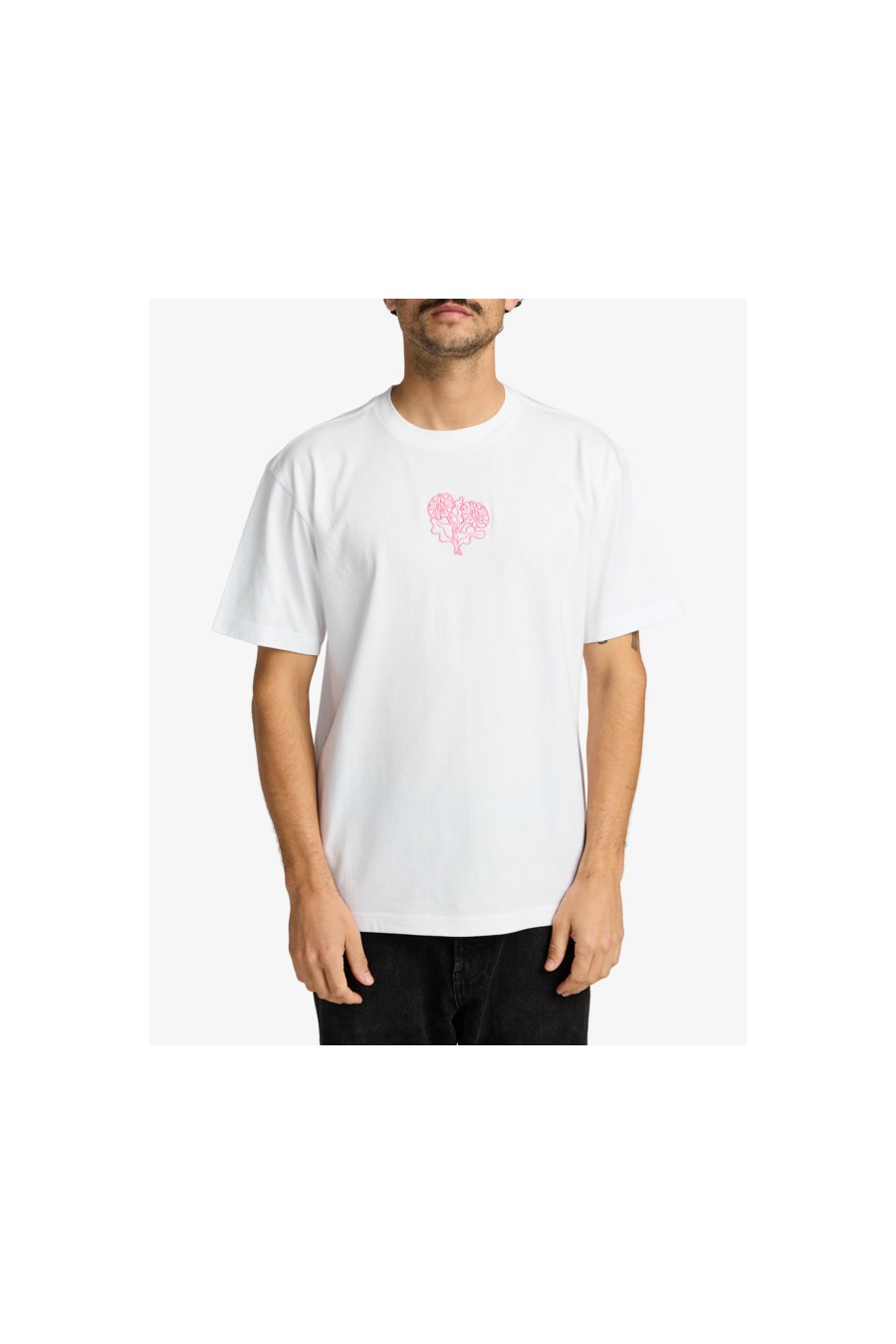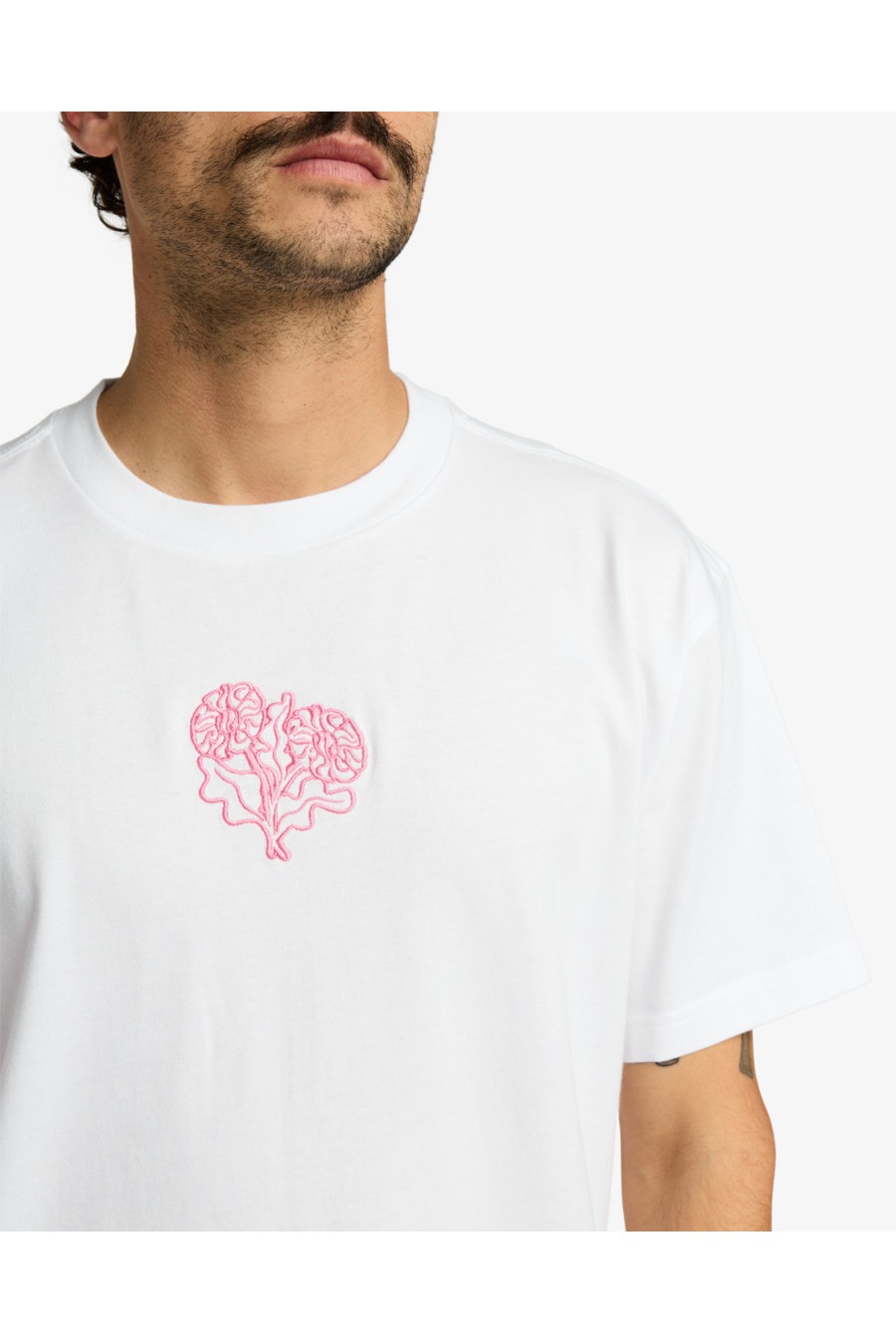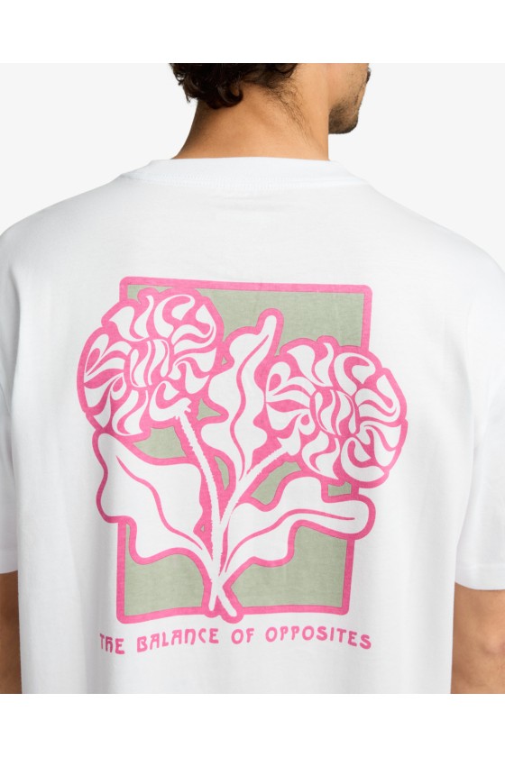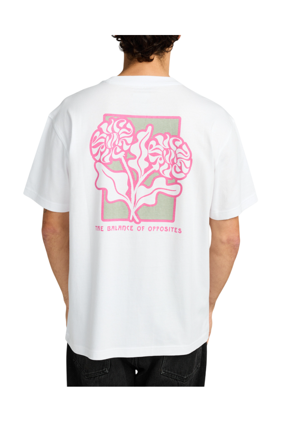 Camiseta de manga corta Rvca Flower Balance en color Blanca, con logotipos en parte delantera y espalda. Camiseta de gramaje medio con corte Relajado, cuello acanalado, redondo y 100% algodón orgánico. La Nueva Colección Rvca Otoño 2025 ya está disponible en Grado 90 Zaragoza.