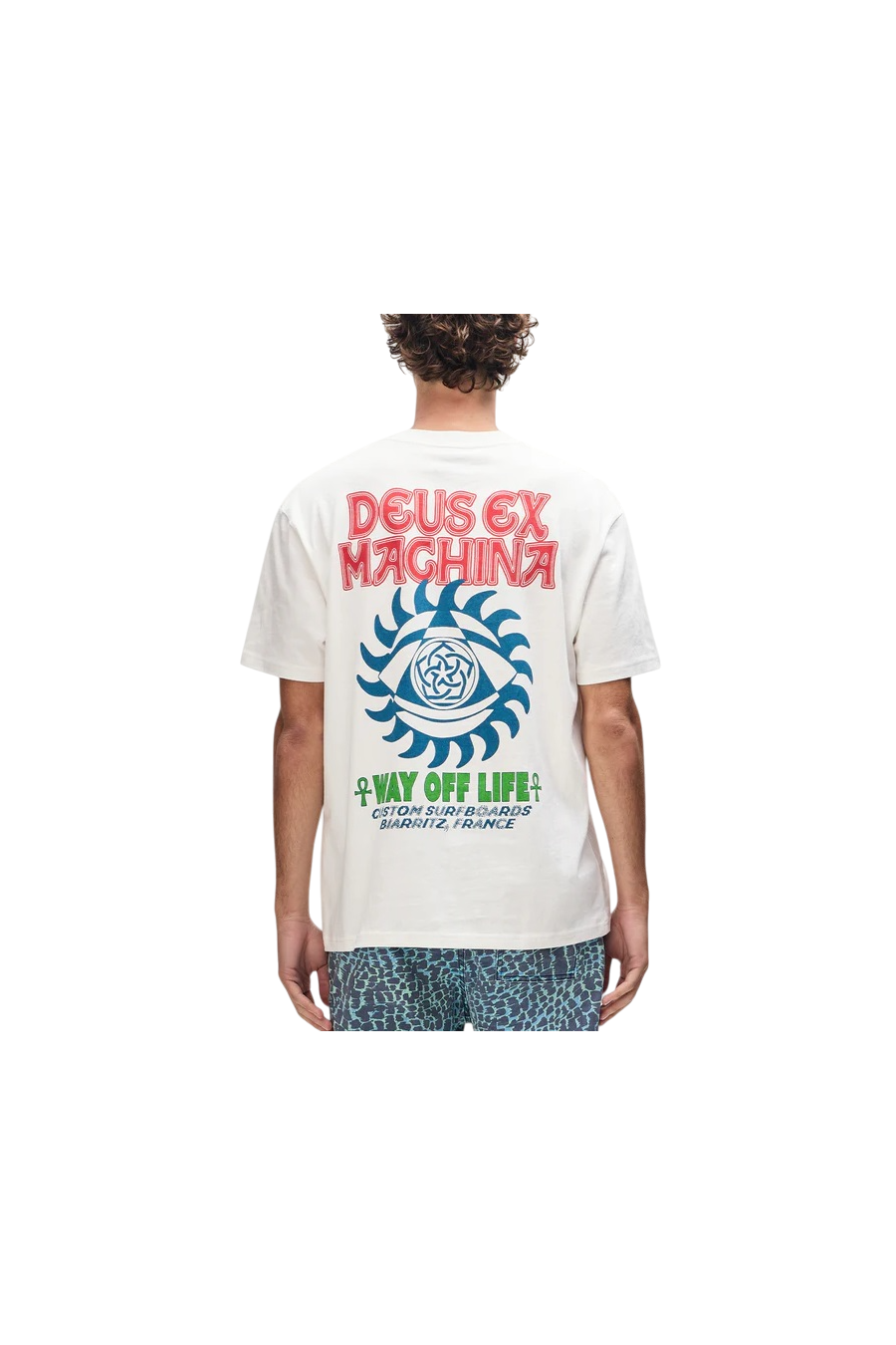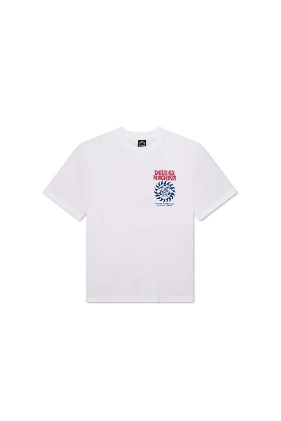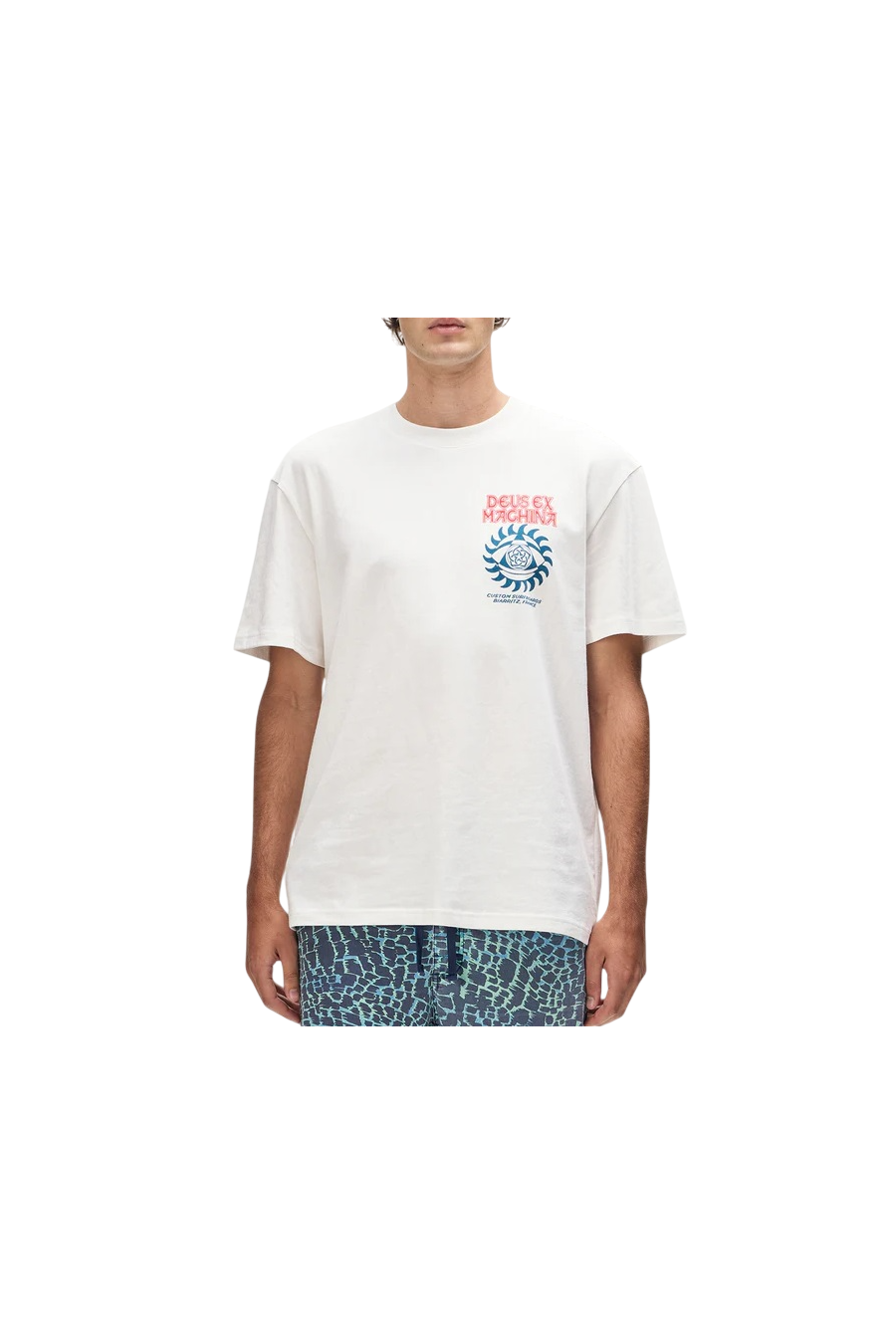 Camiseta de Manga Corta Deus Ex Machina en color blanca, modelo Crank tee, con logotipo delantero y en espalda full color, camiseta con cuello redondo fabricada en 100% algodón reciclado. Una camiseta de corte holgado perteneciente a la nueva temporada 2025 de la marca. Grado 90 Zaragoza.