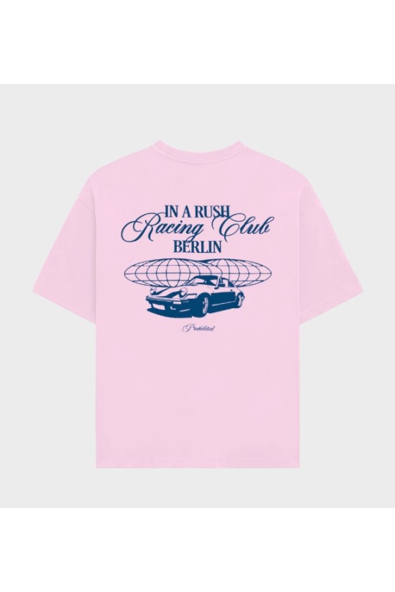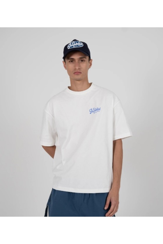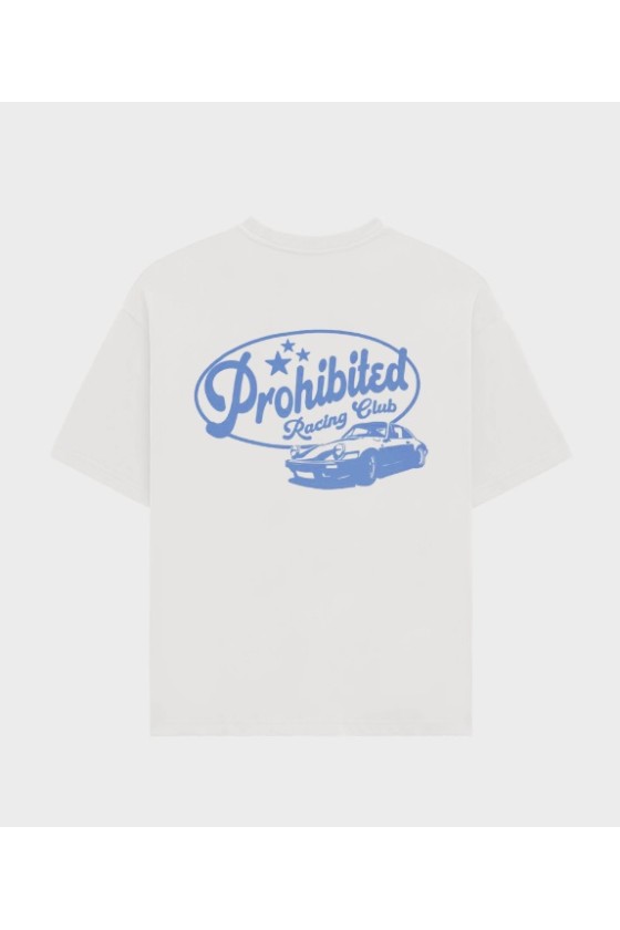 Camiseta Prohibited Berlin de manga corta, corte Holgado cropped, en color blanca con logotipos en pecho y espalda color azul claro tuning club. Fabricada en 100% algodón. Nueva temporada Prohibited ya disponible en Grado 90 Zaragoza.