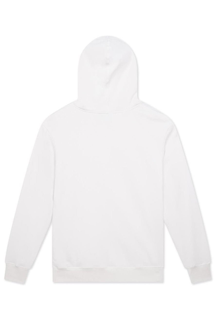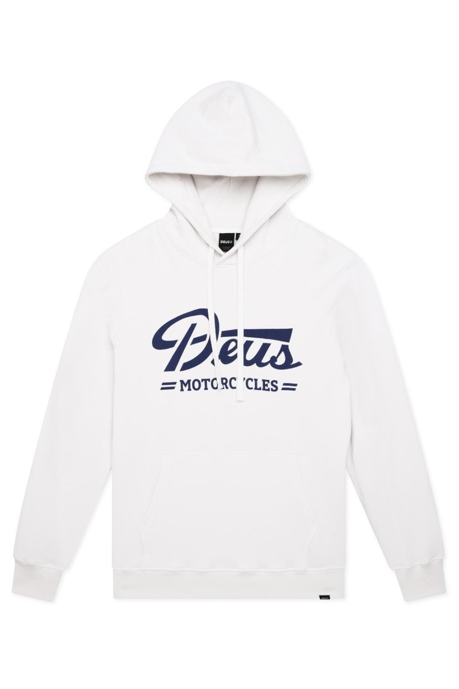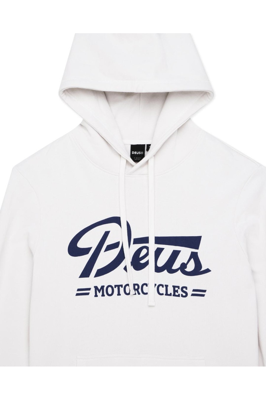 Sudadera Deus Ex Machina modelo downshift hoodie en color blanco roto, con logotipo en azul marino deus motorcycles en parte delantera. Trae capucha ajustable y bolsillos tipo canguro. Fabricada en 100% algodón orgánico premium.