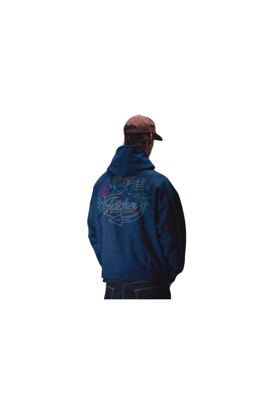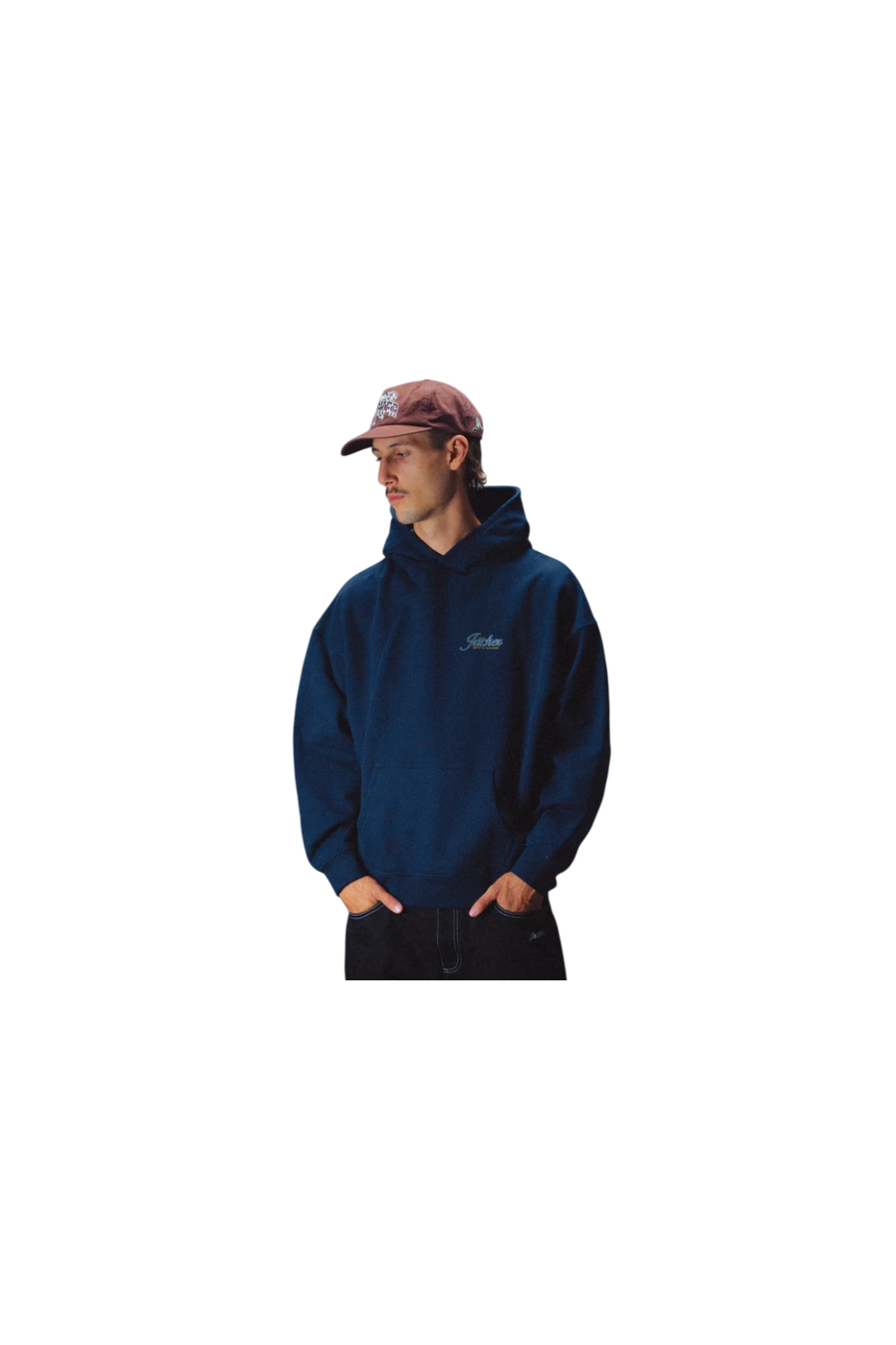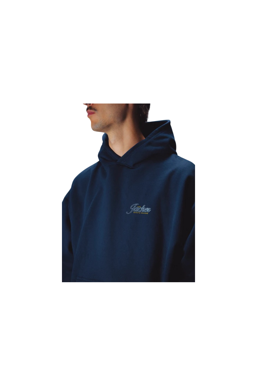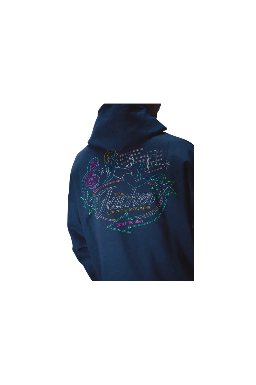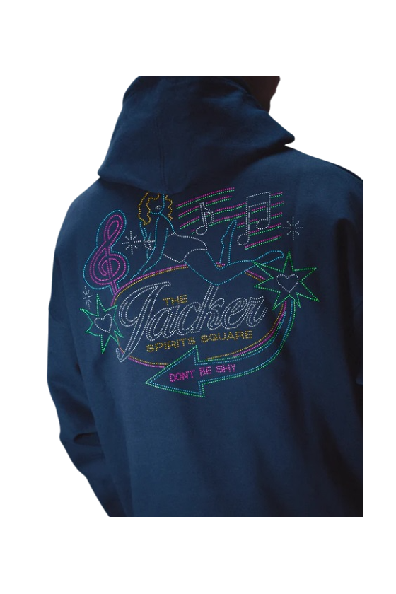 Sudadera Jacker con capucha ajustable, bolsillos tipo canguro, modelo Dont be Shy en color azul marina con logotipo en pecho y espalda de la marca francesa con un toque nocturno, sudadera de alto gramaje fabricada en 100% algodón premium. Nueva colección invierno 2025 de Jacker disponible en grado 90 Zaragoza.