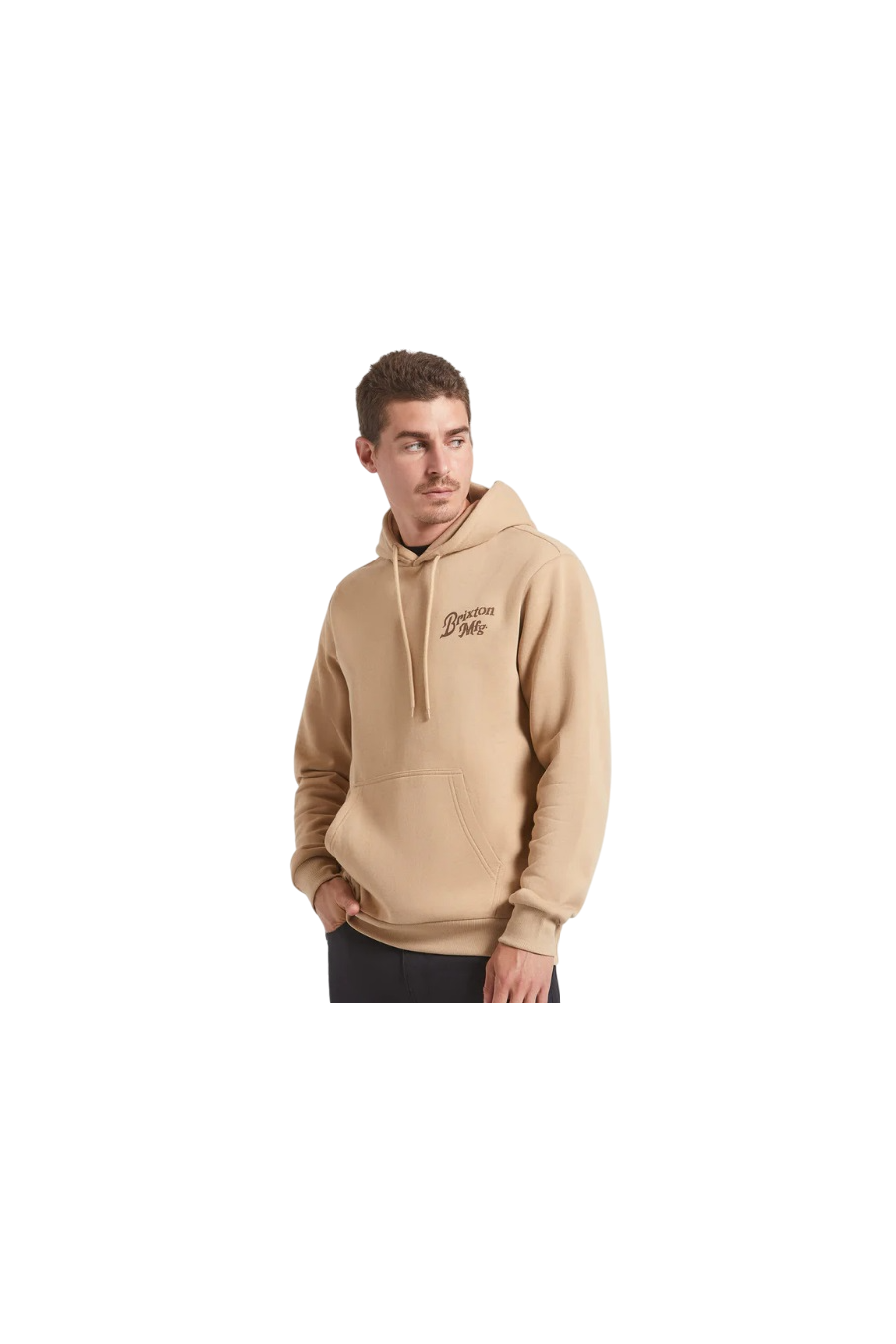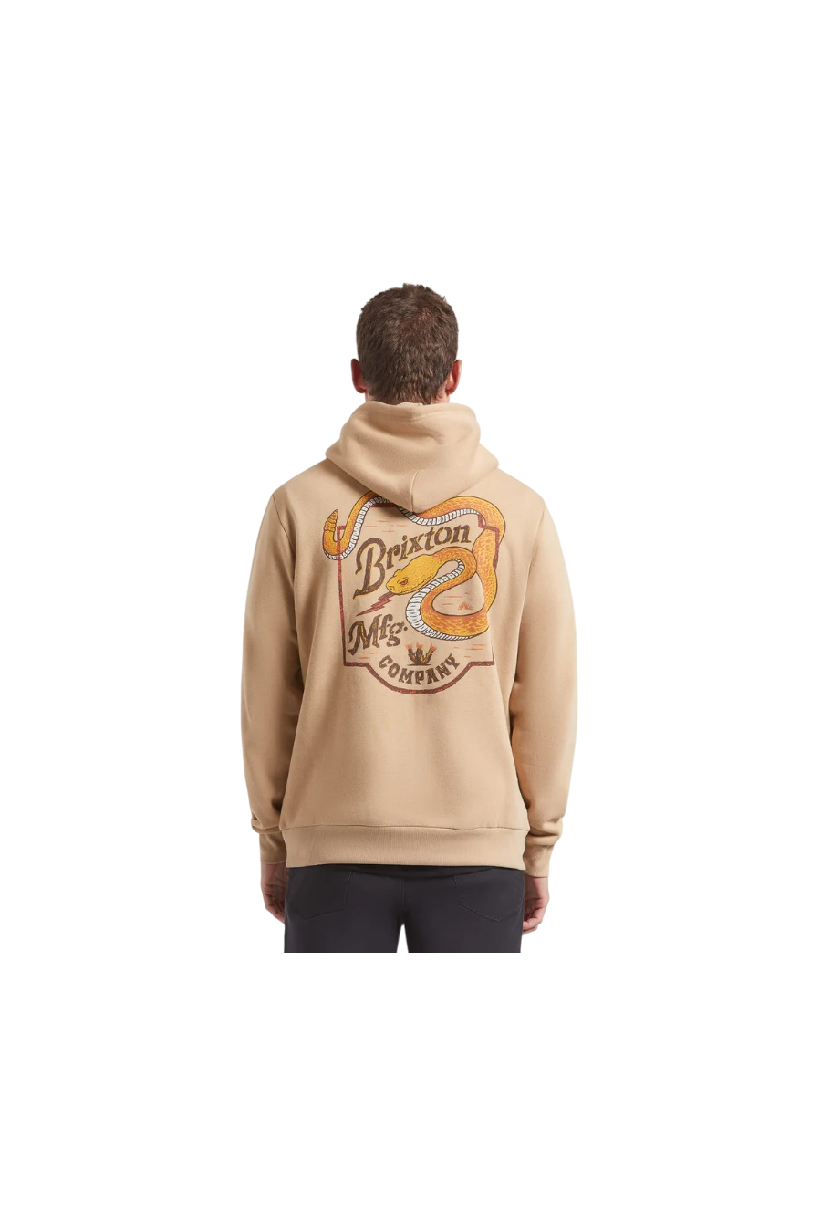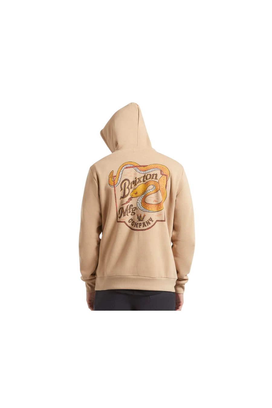 Sudadera Brixton con capucha ajustable, modelo Rothwell Hood con logotipo en pecho y espalda en color arena (sand). Sudadera perteneciente a la nueva colección otoño invierno 2025 de la marca.