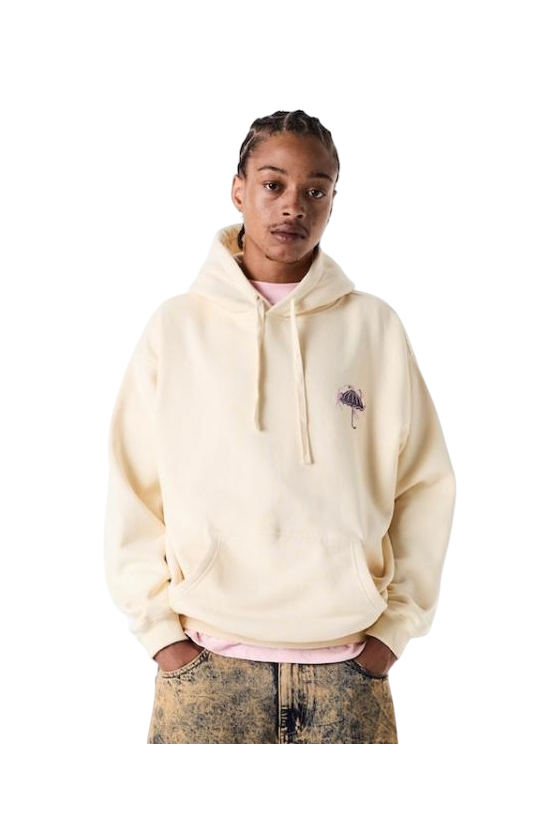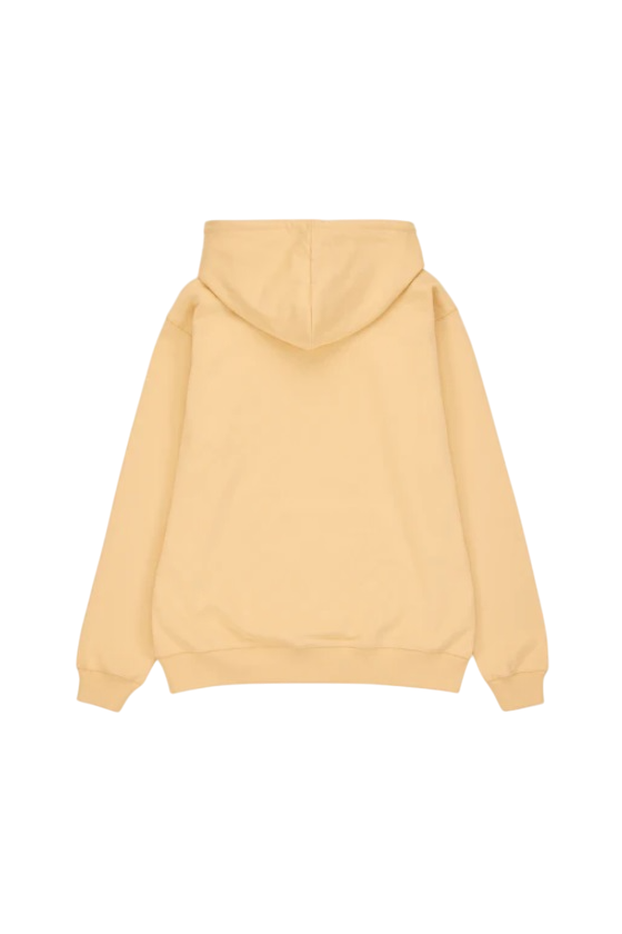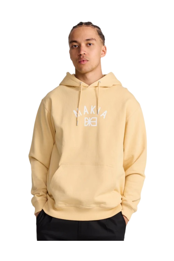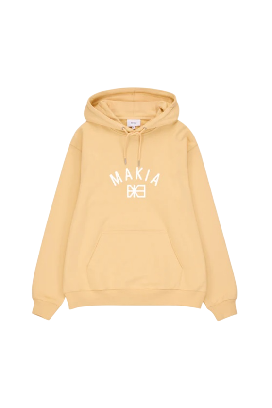 Sudadera Makia con capucha ajustable, en tono amarillo claro (wheat) con logotipo en pecho de makia color blanco. Sudadera perteneciente a la colección otoño invierno 2025. Corte standard, algodón orgánico 100%. Makia Helsinki como siempre la máxima calidad!