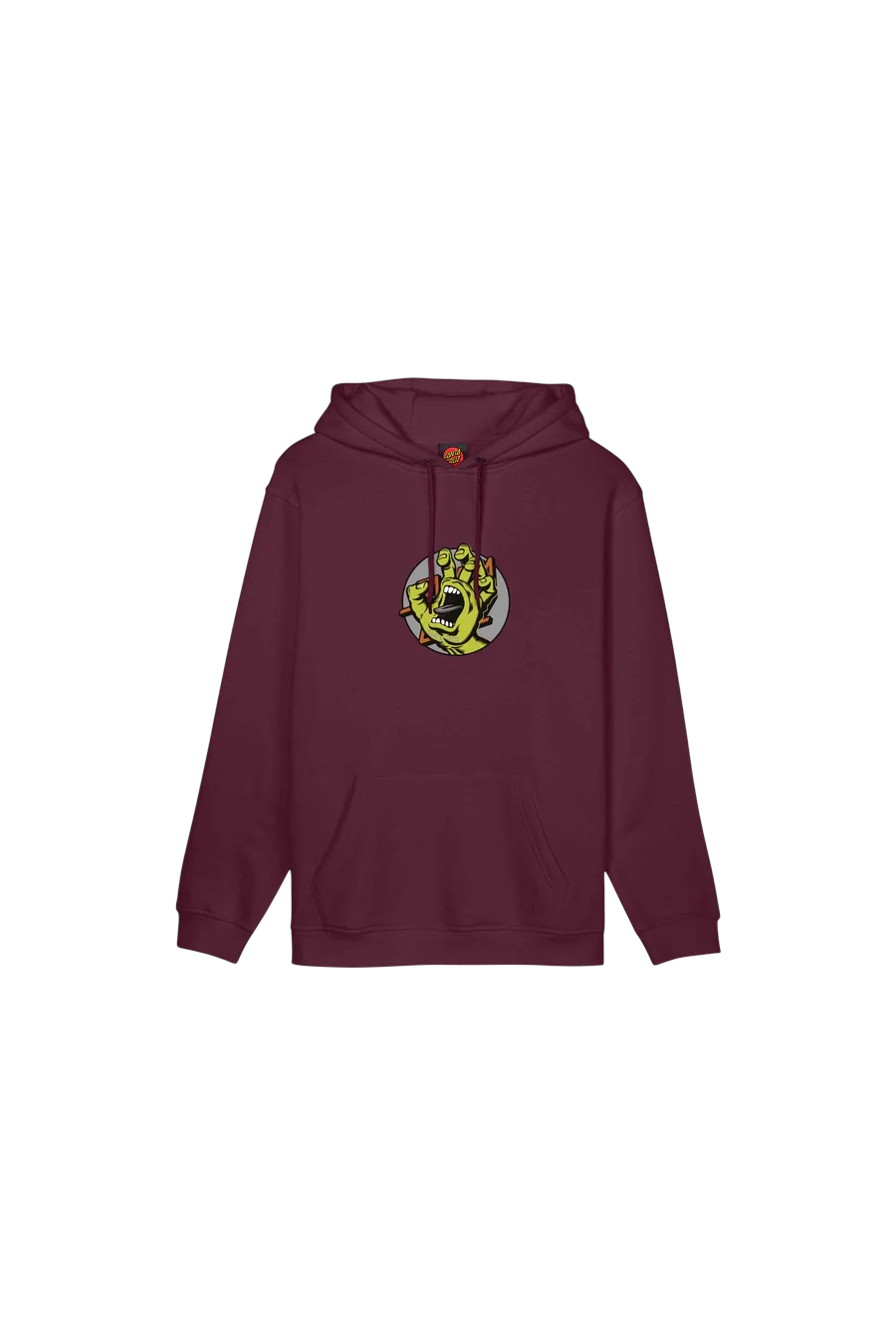 Sudadera santa cruz skateboards en color dark cherry con capucha ajustable y bolsillos delantero estilo canguro, con logotipo frontal de la mítica mano de santa cruz .