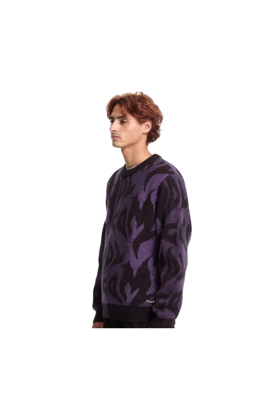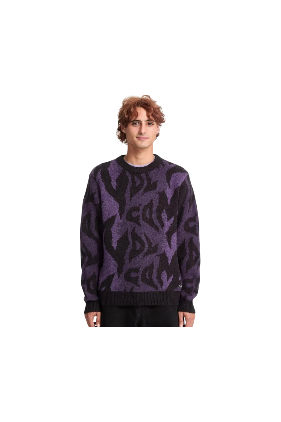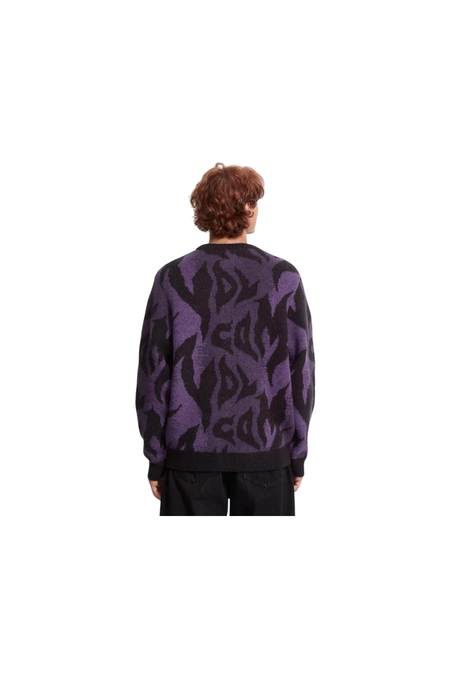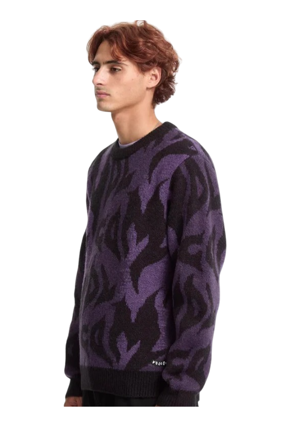Jersey de Punto Volcom modelo anarchietour en color negro y morado. Sin capucha, decorado con logotipo volcom por todo el sweater.