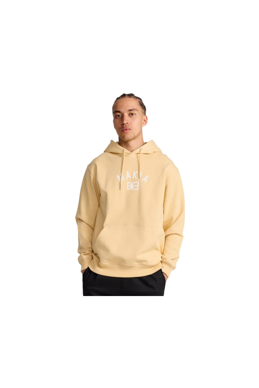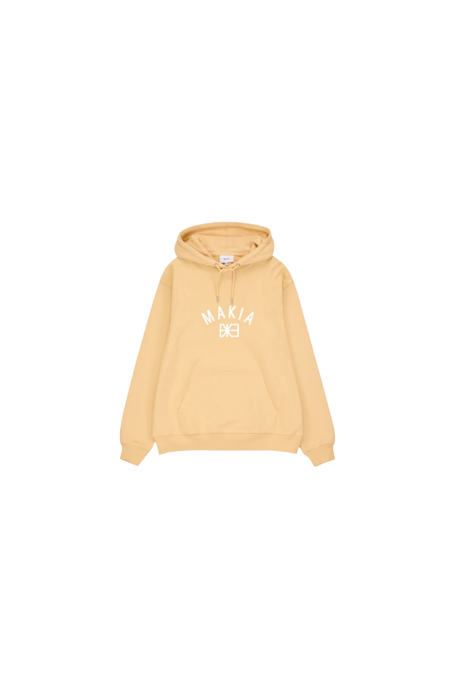 Sudadera Makia con capucha ajustable, en tono amarillo claro (wheat) con logotipo en pecho de makia color blanco. Sudadera perteneciente a la colección otoño invierno 2025. Corte standard, algodón orgánico 100%. Makia Helsinki como siempre la máxima calidad!