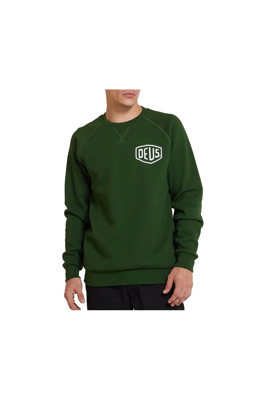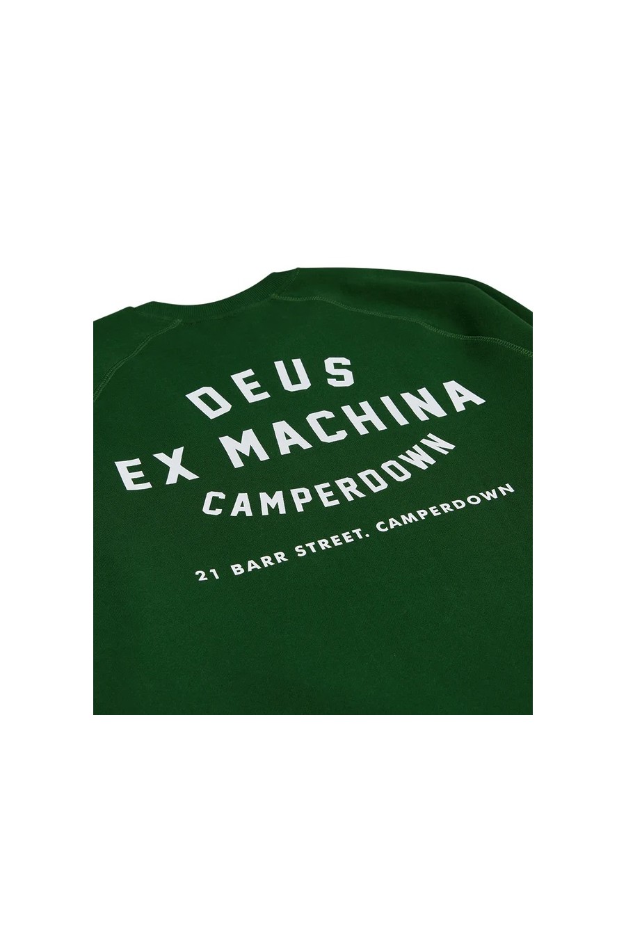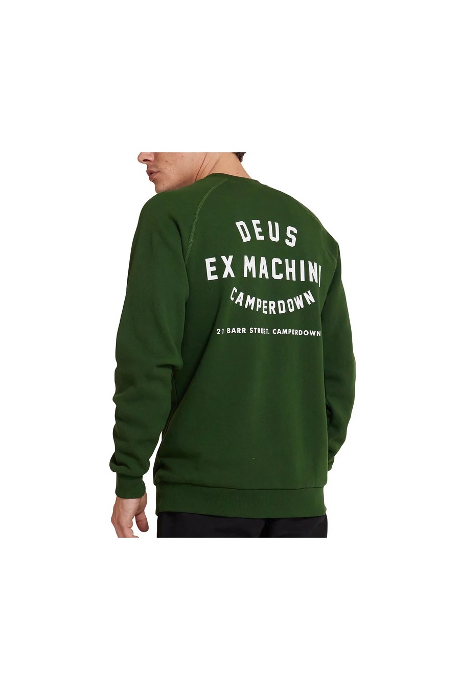Sudadera Deus Ex Machina modelo Camperdown address en color verde (cypress green), con logotipos en color blanco en pecho y espalda. Sudadera sin capucha. Corte Raglan. Forma parte de la colección clásica de la marca. Fabricada en 100% algodón orgánico premium.