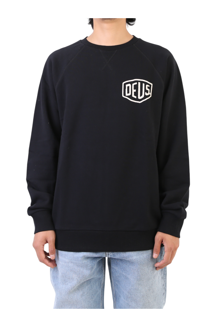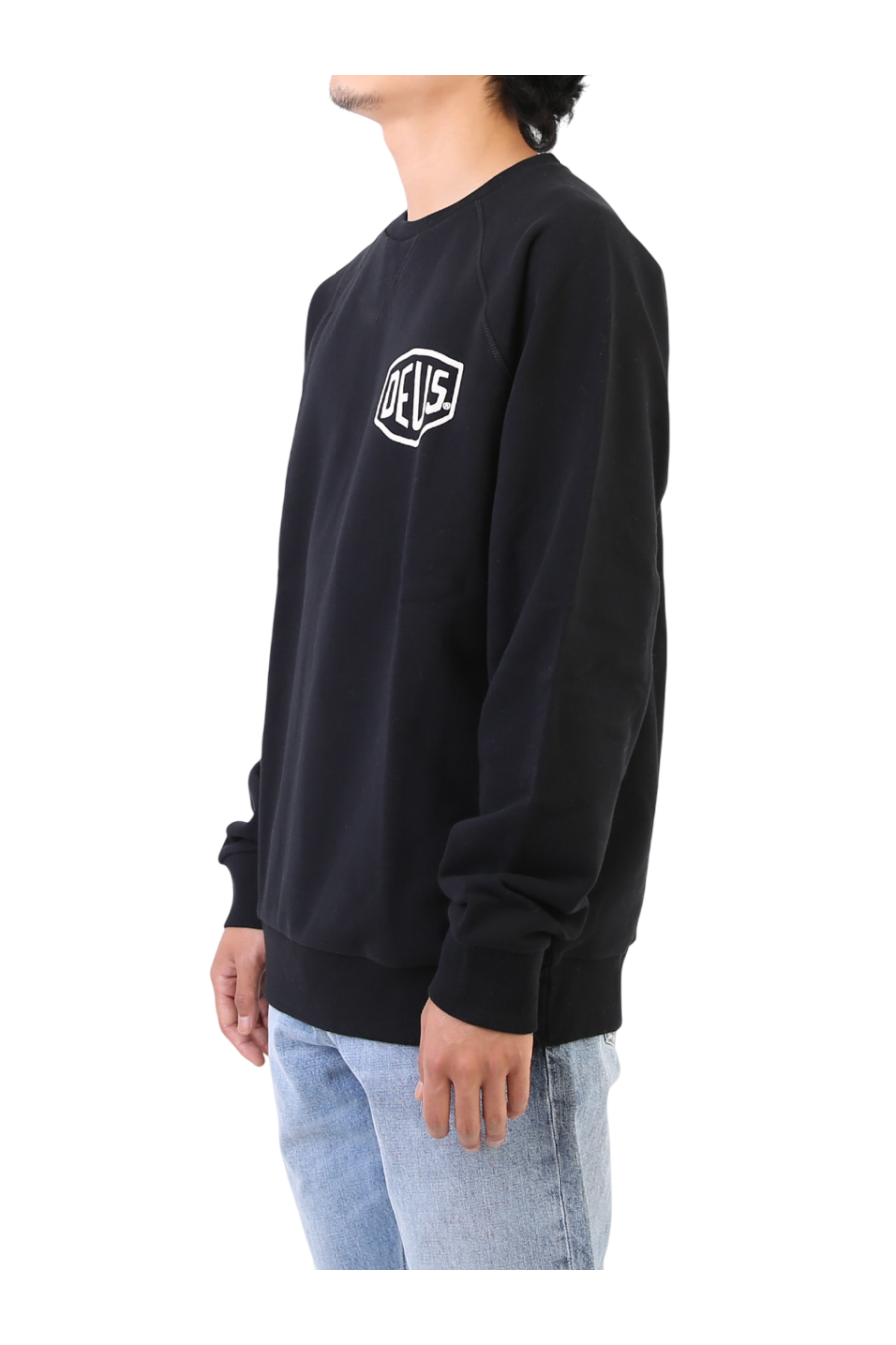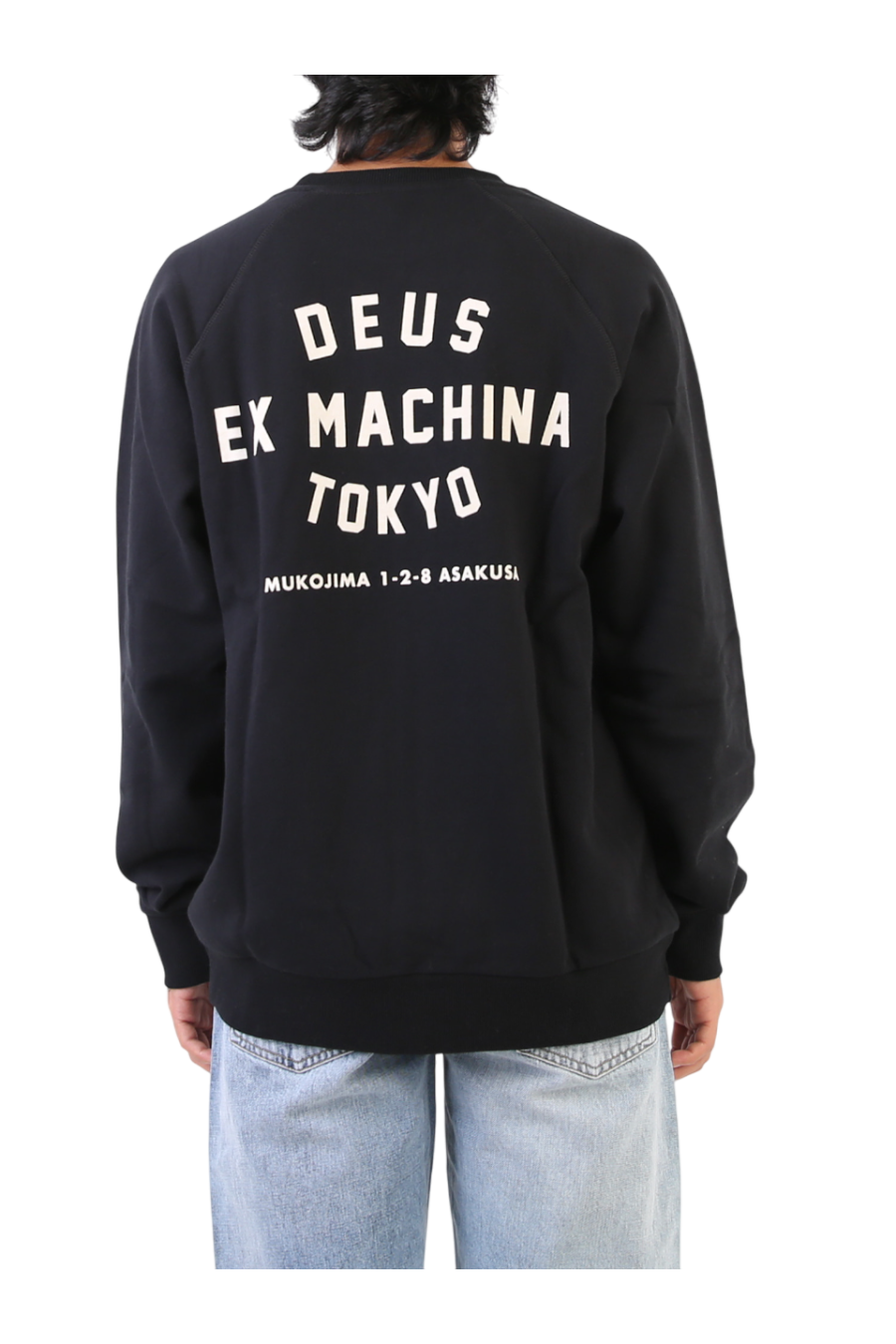 Sudadera Deus Ex Machina modelo Harajuku address en color negra, con logotipos en color blanco en pecho y espalda. Sudadera sin capucha. Corte de manga estilo Raglan. Forma parte de la colección clásica de la marca. Fabricada en 100% algodón orgánico premium.