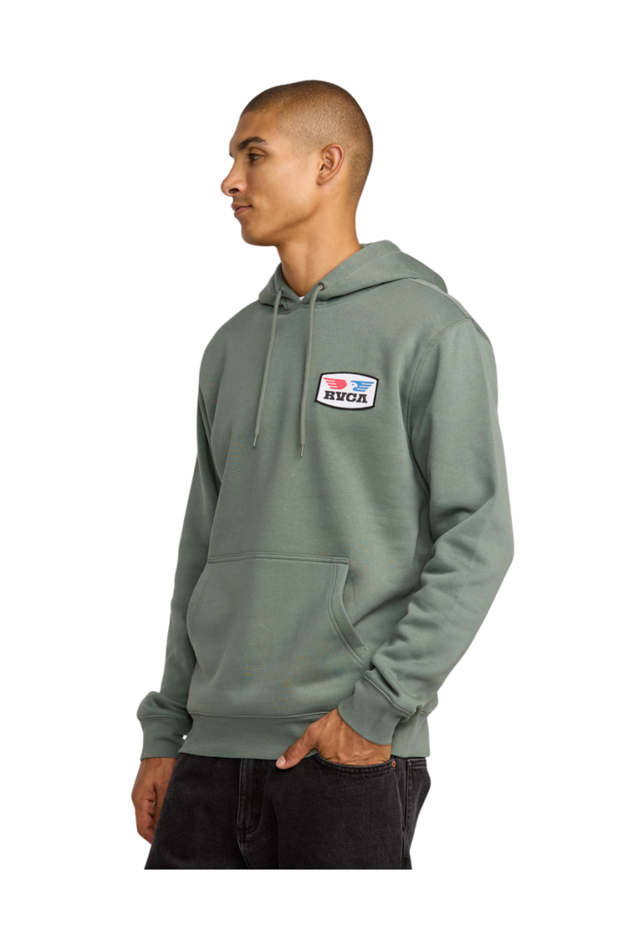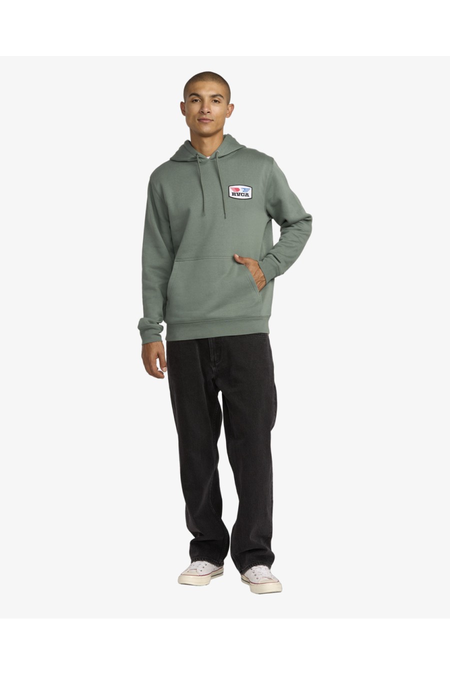 Sudadera con capucha de Rvca, modelo Soar en color verde (jade) con logotipo frontal en pecho estilo etiqueta, bolsillo delantero tipo canguro y capucha ajustable. Corte Normal, con puño y dobladillos acanalados. Colección otoño invierno 2025 ya disponible de Rvca.
